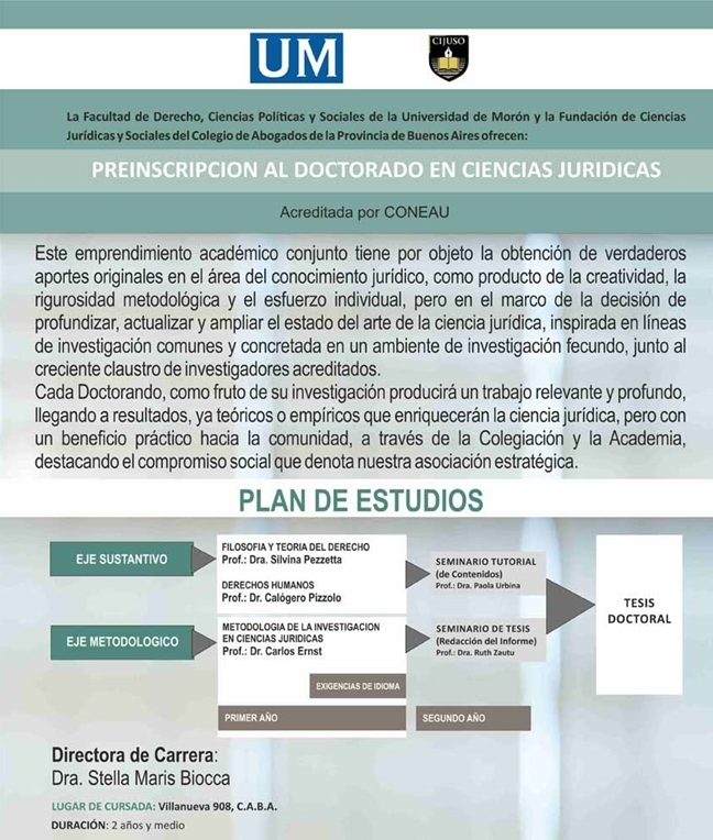 La Fundación CIJUSO y la Facultad de Derecho, Ciencias Políticas y Sociales de la Universidad de Morón invitan a los matriculados a la Preinscripción al DOCTORADO EN CIENCIAS JURÍDICAS que se dictará este año en la sede de la Fundación.