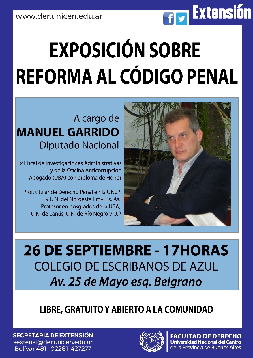 La Facultad de Derecho de la UNICEN invita a participar de la exposición sobre la Reforma al Código Penal a cargo del Diputado Nacional Manuel Garrido el próximo viernes 26 de septiembre a las 17 horas en el Colegio de Escribanos de la ciudad de Azul, sito en Avda. 25 de Mayo esquina Belgrano.