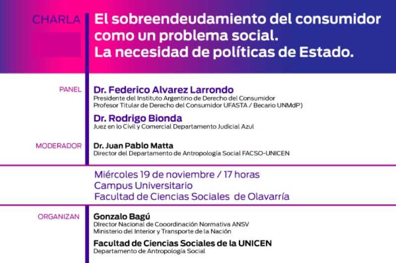 El panel estará conformado por el Dr. Federico Alvarez Larrondo, presidente del Instituto Argentino de Derecho del Consumidor y profesor titular de Derecho del Consumidor (UFASTA/ Becario UNMdP); y por el Dr. Rodrigo Bionda, Juez en lo Civil y Comercial del Departamento Judicial de Azul y será moderado por el Dr. Juan Pablo Matta, director del departamento de Antropología Social de la Facultad de Ciencias Sociales.