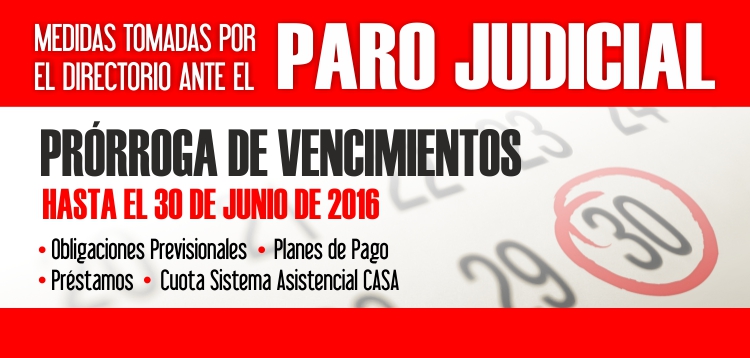 Asimismo, ante la emergencia, el Directorio resolvió aprobar la Prórroga de Vencimientos de las obligaciones previsionales, planes de pago, préstamos y cuotas del Sistema Asistencial hasta el 30 de junio de 2016: http://www.cajaabogados.org.ar/vermas-noticias.php?n=754#.VzYFzNThCmw