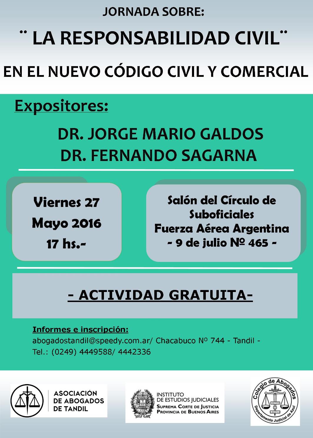 Por medio de la presente, se informa a los asociados, colegas, estudiantes y público en general asistente a las Jornadas que se realizarán el viernes 27 de mayo y tratarán sobre “Responsabilidad Civil” en el nuevo Código Civil y Comercial.