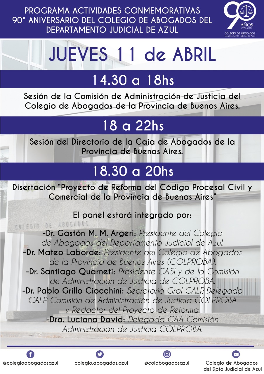 De 18.30 a 20hs: Disertación: “Proyecto de Reforma del Código Procesal Civil y Comercial de la Provincia de Buenos Aires”