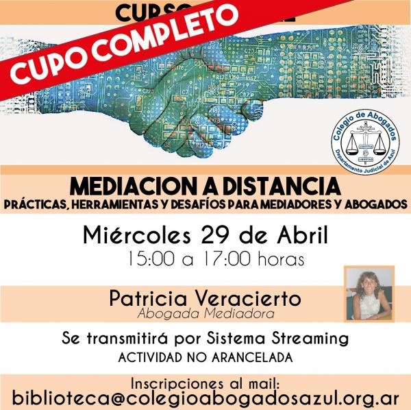 La Abogada Mediadora Patricia Veracierto disertará sobre esta temática el miércoles 29/04 de 15 a 17hs, vía streaming. Esta capacitación es no arancelada. Inscripciones. biblioteca@colegioabogadosazul.org.ar