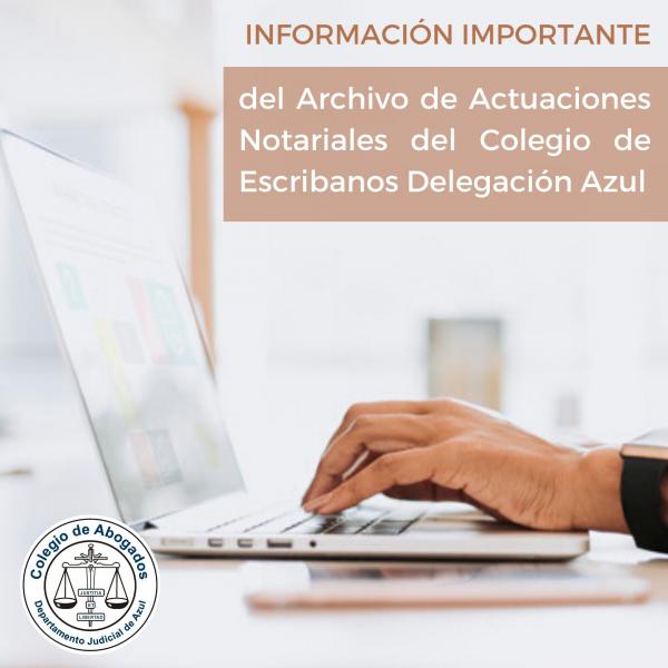 Se informa que desde el 13/7 el Archivo de Actuaciones Notariales del Colegio de Escribanos de la Delegación Azul (que comprende los Protocolos de los escribanos de los Partidos de: Azul, Bolívar; Gral. Alvear, Gral. Lamadrid, Laprida, Las Flores, Tapalqué y Olavarría); por falta de espacio y posibilidad de crecimiento edilicio se trasladaron Tandil, Rauch y Ayacucho al Archivo de La Plata. El domicilio electrónico es: colegioescribanos-archivonotarial-az@ces.notificaciones