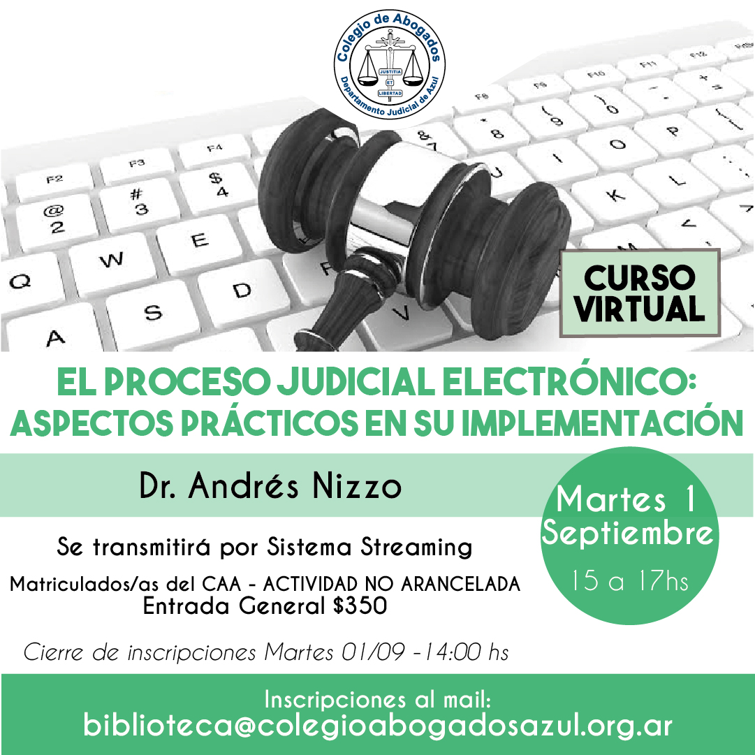 El Dr. Andrés Nizzo abordará esta temática con un amplio temario, el martes 1/09 de 15 a 17hs, vía streaming. Los interesados pueden inscribirse hasta las 14 hs de ese día: biblioteca@colegioabogadosazul.org.ar