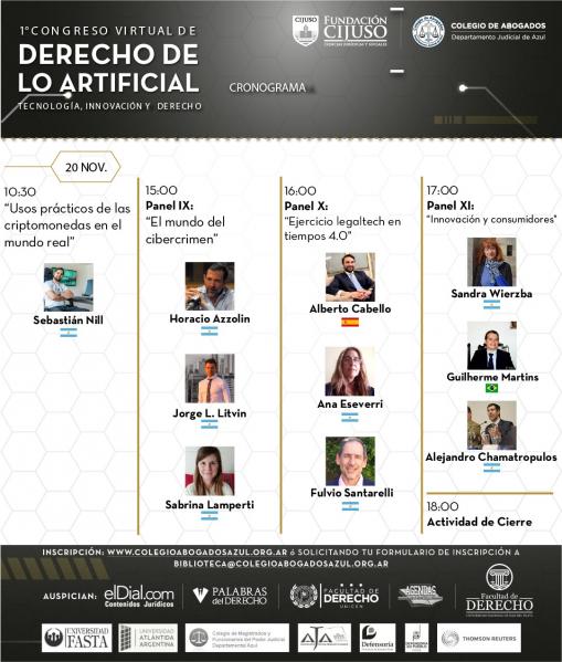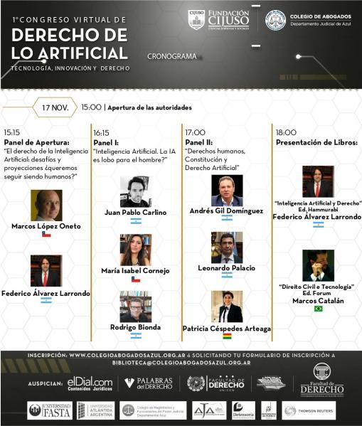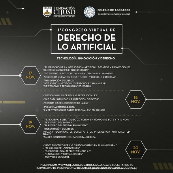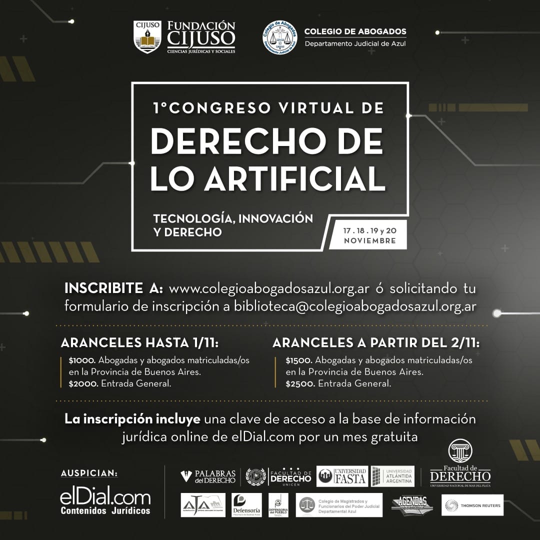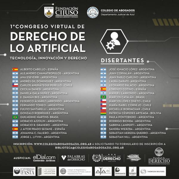 El I Congreso Virtual de Derecho de lo Artificial es organizado por el Colegio de Abogados del Departamento Judicial de Azul y Fundación CIJUSO, contando con el auspicio del Colegio de Magistrados y Funcionarios del Poder Judicial Departamental, elDial.com, Facultad de Derecho UNICEN, Facultad de Derecho UNMDP, Universidad FASTA, Universidad Atlántida Argentina, Defensoría del Pueblo Provincia de Buenos Aires, Defensoría del Pueblo Tandil, Thomson Reuters, Palabras del Derecho, Agrupación Jóvenes Abogados de Madrid y Agendas de Direito Civil Constitucional de Brasil.