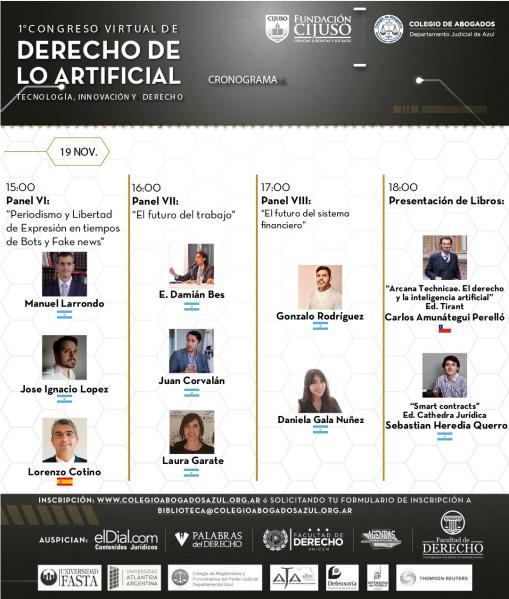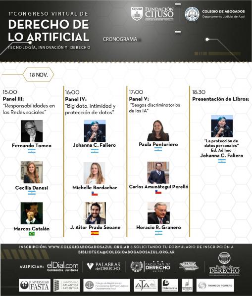 Destacados profesionales como Andres Gil Dominguez, Juan Corvalan, Johanna Faliero, Cecilia Danesi, Fernando Tomeo, Federico Alvarez Larrondo, Sandra Wierzba, Horacio Azzolin, Marcos Catalán y Horacio R. Granero entre otros; desde Chile, Bolivia, Francia, Italia, Brasil, España y Argentina disertan sobre “Tecnología, innovación y derecho” vía streaming. Se entregarán certificados.
