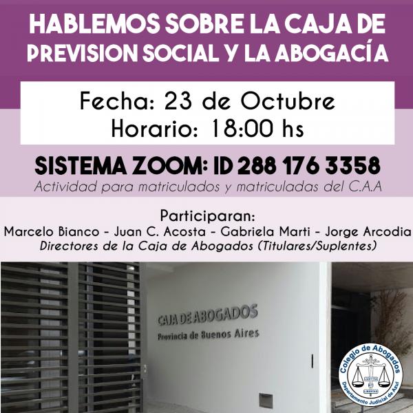 Invitamos a las matriculadas y matriculados del C.A.A interesados en la temática, este viernes 23/10 a las 18hs. Participarán: Marcelo Bianco, Juan C. Acosta, Gabriela Marti y Jorge Acordia; Directores de la Caja de Abogados (Titulares/Suplentes). Podrás conectarte vía Zoom utilizando el ID: 288 176 3358