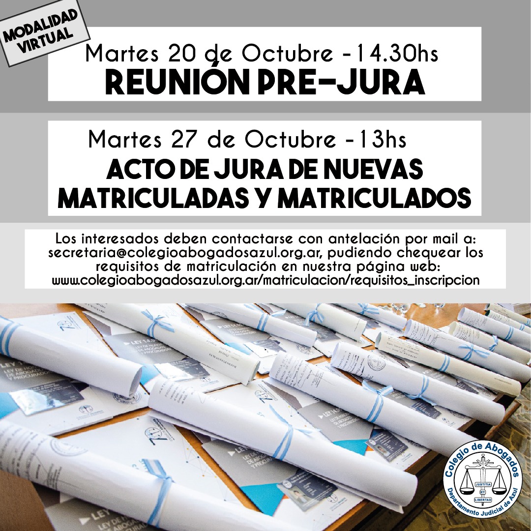 Ambas actividades se realizarán con modalidad virtual. El martes 20/10 a las 14.30hs se realizará la reunión Pre-Jura. Los interesados deben contactarse con antelación por mail a: secretaria@colegioabogadosazul.org.ar, pudiendo chequear los requisitos de matriculación haciendo click aquí