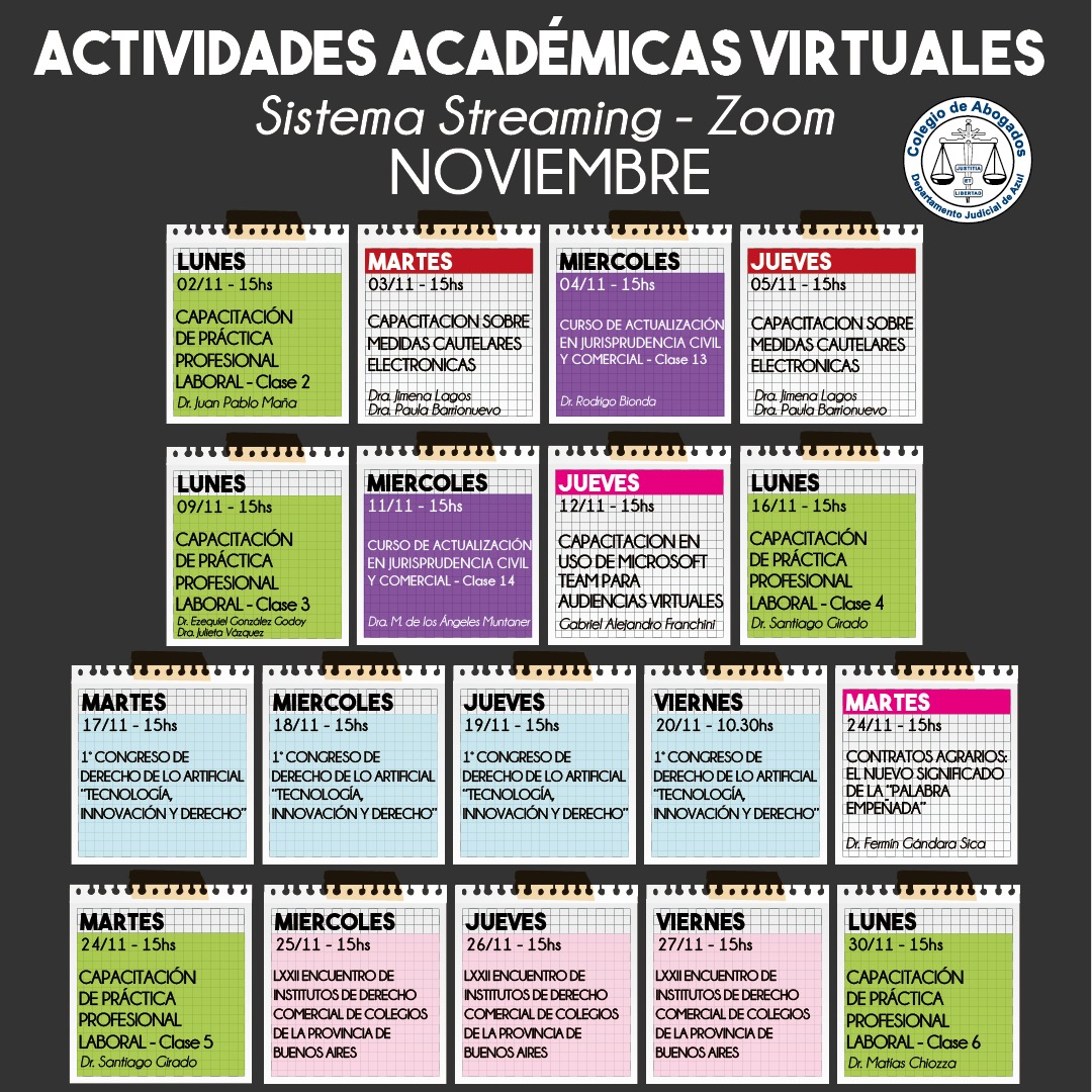 Compartimos el detalle de las actividades académicas que se brindarán vía streaming y zoom, durante este mes. Consultas, por mail: biblioteca@colegioabogadosazul.org.ar