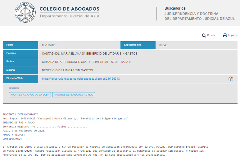 El 4 de agosto de 2020, desde el Colegio de Abogados de Azul, publicamos dos sentencias de la Cámara de Apelaciones en lo Civil y Comercial de Necochea y una de la Cámara de Dolores. En las mismas se imponía al Poder Judicial como obligado al pago de los honorarios del Defensor Oficial Ad-hoc, integrar la parte correspondiente de los aportes previsionales. Este mismo criterio se ha adoptado en ambas Salas de la Cámara de Apelaciones en lo Civil y Comercial Departamental, la Sala 2 en autos "CASTAGNOLI MARIA INES s/. BENEFICIO DE LITIGAR SIN GASTOS" (https://jurisprudencia.colegioabogadosazul.org.ar/215-66348) expuso: "... la obligación del Poder Judicial de integrar la parte correspondiente a los aportes previsionales en relaciona los honorarios regulados a la apelante por su actuación como Defensora Ad-Hoc ante la justicia de Paz. En la especie, la Dra. M.G.B, fue designada para actuar como Defensor de Pobres y Ausentes de la Sra. M.E.C en el presente beneficio de litigar sin gastos (despacho del 25/11/19), acorde lo normado por art. 91 de la Ley orgánica del Poder Judicial N° 5827. Con fecha 4/08/2020 se regularon sus honorarios de conformidad con lo dispuesto por el art. 91 referido y los Ac. SCBA n° 3391 y 3912. En torno a los honorarios reconocidos a los Defensores de Pobres y Ausentes que actúan en el ámbito de la Justicia de Paz, al art. 91 de la ley 5827 establece que: “Por su intervención, el letrado percibirá una remuneración con cargo al presupuesto del Poder Judicial, en la forma que establezca la Reglamentación de la Suprema Corte de Justicia, que deberá prever una escala de honorarios a valores de la unidad arancelaria prescripta por el DL 8904/77 a fin de que el Juez de Paz Letrado regule los honorarios en orden a la importancia y complejidad del trabajo realizado… “. Por su parte, en el art. 12 inc. A) de la Ley 6716, se pone a cargo del obligado al pago de los honorarios el aporte derivado de los mismos en el porcentaje allí previsto. De manera que, así como los letrados aportan por su actividad profesional privada no se advierte razón para que, cuando son designados para actuar ante la justicia de paz en carácter de defensores y asesores Ad-hoc y se regulan honorarios por dicha actuación, no se adicione el porcentaje del aporte correspondiente a cargo del obligado de los honorarios, en este caso, el Poder Judicial. Ello por cuanto el abogado debe cumplir con un aporte mínimo anual para tener derecho a una jubilación (art. 1 6716) y toda actividad profesional, ya sea en forma autónoma como en el caso de los defensores y asesores Ad-hoc, o en relación de dependencia como los funcionarios del Ministerio Publico, debe aportar a los Cajas Previsionales. En función de lo expuesto, corresponde hacer lugar al recurso de apelación deducido por la apelante y modificar la resolución apelada disponiendo que los honorarios regulados a la Dra. B. debe adicionarse el aporte previsional en el porcentaje correspondiente, a cargo del obligado al pago de los honorarios.