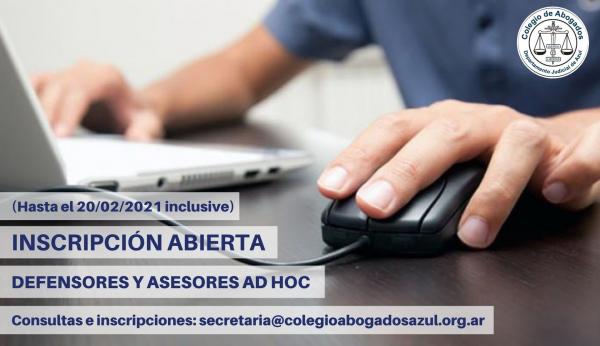 La inscripción se podrá efectuar ante el Colegio de Abogados Departamental, personalmente o por e mail a secretaria@colegioabogadosazul.org.ar, hasta el 20 de febrero de 2021 inclusive.-