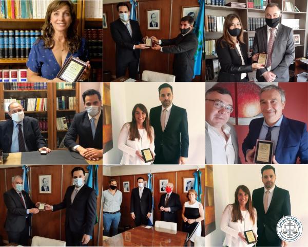 Autoridades del Colegio de Abogados Departamental entregan las placas y medallas, como reconocimiento a la trayectoria profesional y su valioso aporte a la abogacía, a quienes oportunamente felicitamos en el “Día del abogado”, más allá de no haberlo podido celebrar como tradicionalmente hacemos, por el contexto de pandemia aún vigente.