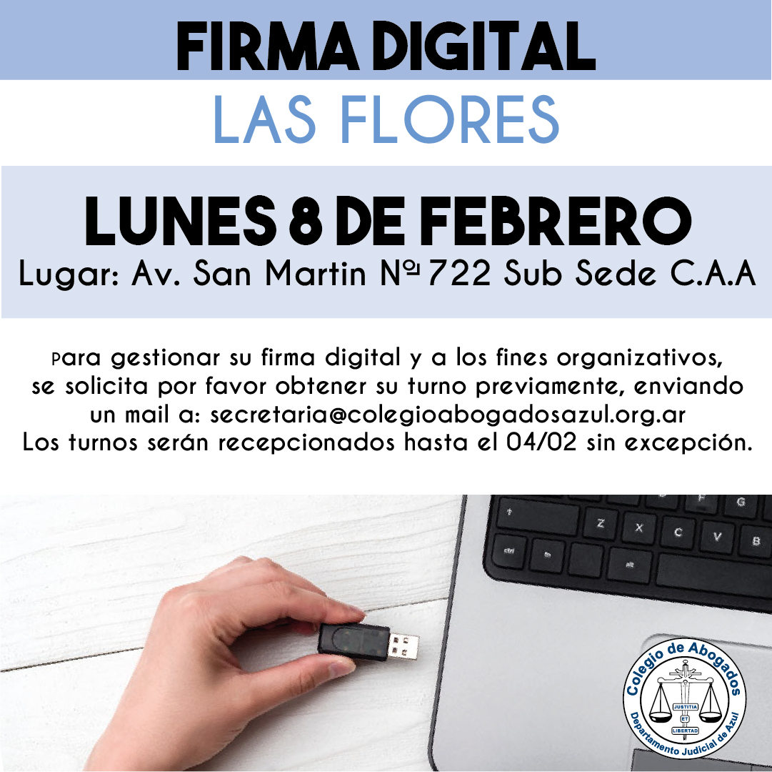 El próximo lunes 8/02, en la subsede del C.A.A de Las Flores (San Martín 722) matriculadas y matriculados podrán realizar el trámite. A los fines organizativos, se solicita gestionar su turno antes del 4/02, sin excepción, enviando un mail a: secretaria@colegioabogadosazul.org.ar