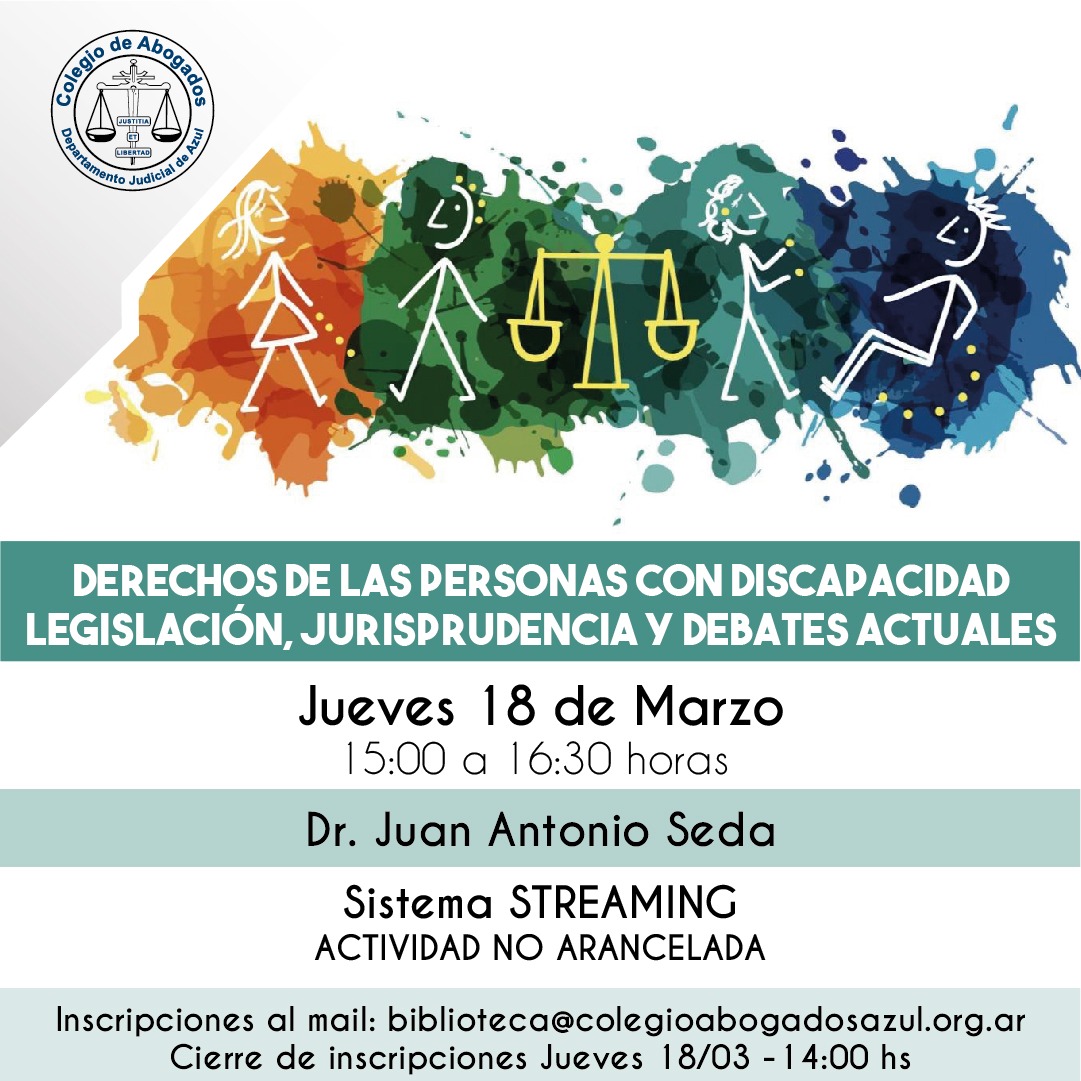 El Dr. Juan Antonio Seda disertará sobre esta temática el jueves18/03 de 15 a 16:30 hs, a través del Sistema Streaming. Será una actividad no arancelada. Inscripciones hasta ese día a las 14hs: biblioteca@colegioabogadosazul.org.ar