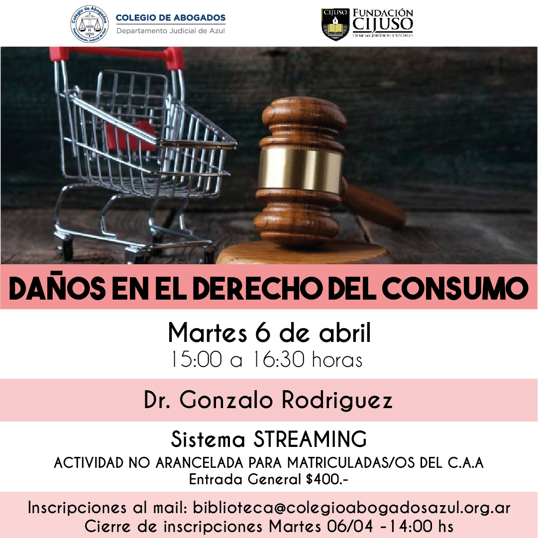 El Dr. Gonzalo Rodríguez disertará sobre esta temática el martes 6/04 de 15 a 16.30hs, vía sistema Streaming. Organizada por Fundación CIJUSO y el Colegio de Abogados Departamental, esta capacitación es no arancelada para matriculadas y matriculados del C.A.A. Inscripciones hasta ese día a las 14hs, por mail a: biblioteca@colegioabogadosazul.org.ar