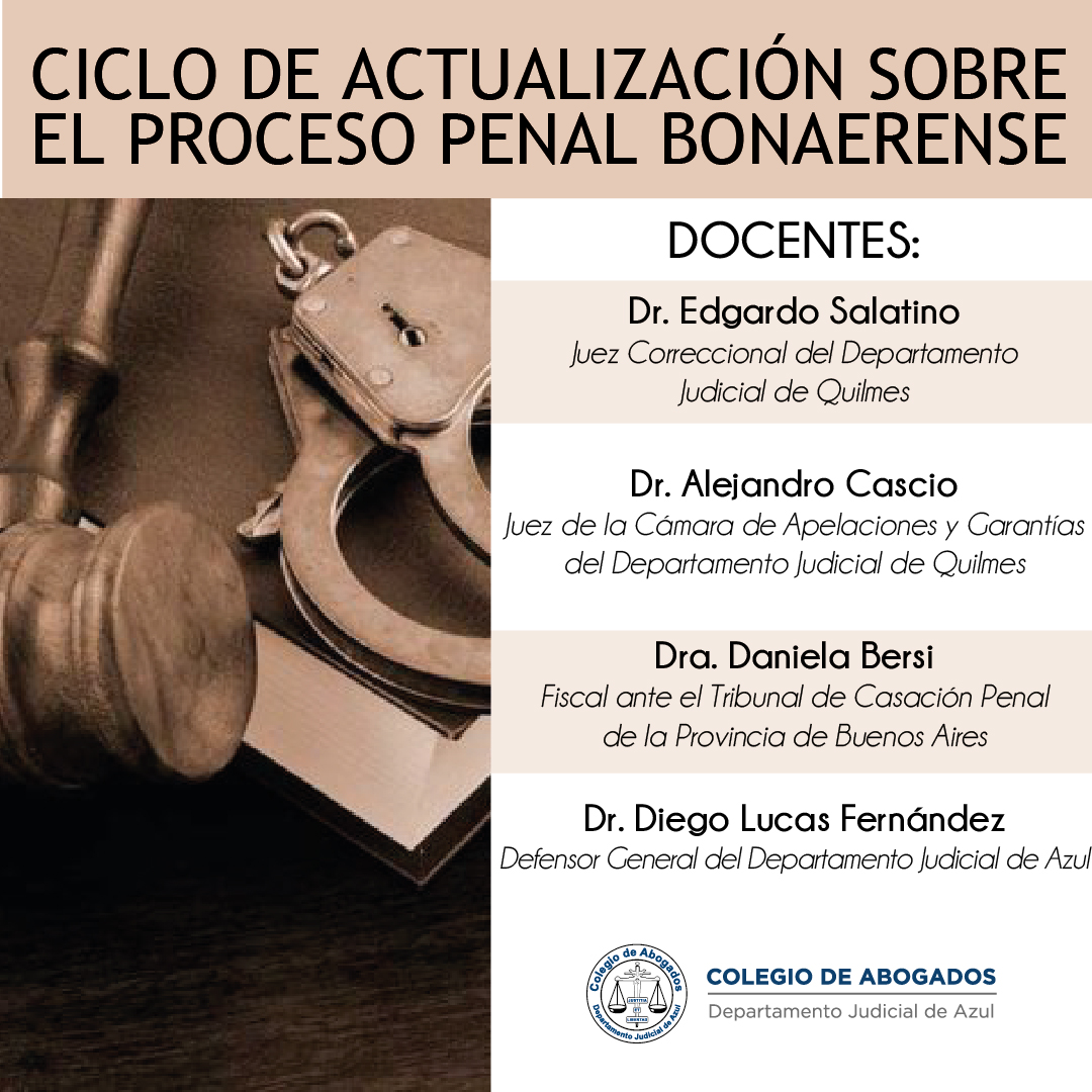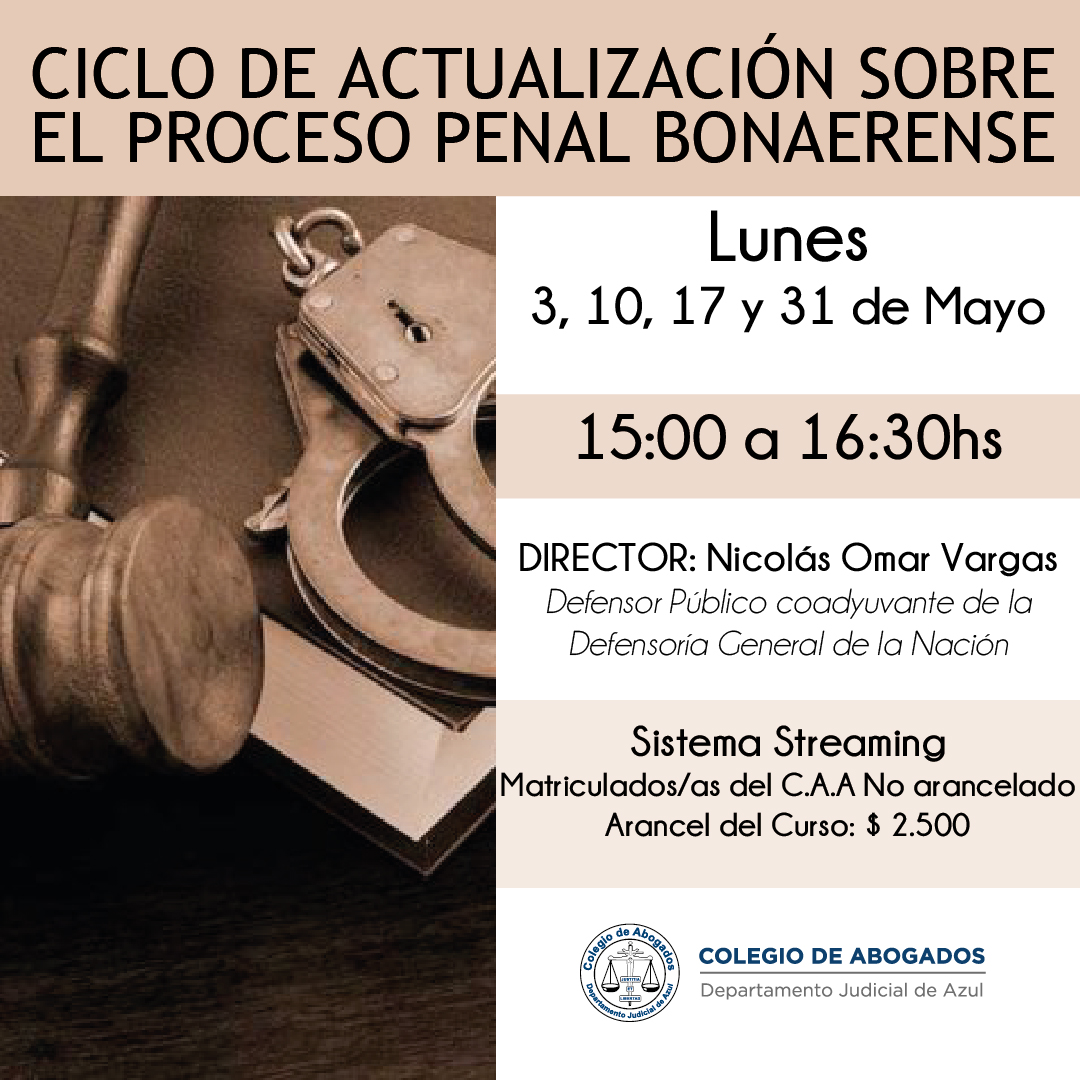 Dirigido por Nicolás Omar Vargas, Defensor Público coadyuvante de la Defensoría General de la Nación, este ciclo vía streaming contará con un destacado equipo docente. Se cursará durante cuatro jornadas el 03/05, 10/05, 17/05 y 31/05 de 15 a 16.30 hs. No arancelado para matriculadas y matriculados del C.A.A. Inscripciones haciendo click aquí