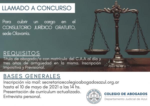 El Colegio de Abogados del Departamento Judicial de Azul llama a concurso para cubrir un cargo para el Consultorio Jurídico Gratuito en la sede de Olavarría. Hoy 10/05/21 a las 14hs finaliza la inscripción, por mail a: secretaria@colegioabogadosazul.org.ar