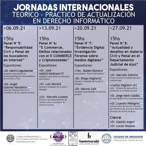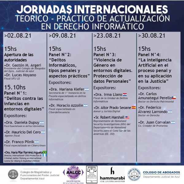 Lunes 2 de Agosto de 2021. Comienza el Curso Internacional de actualización en Derecho Informático con destacados disertantes. Todos los lunes de agosto y septiembre, los Colegios de Abogados y de Magistrados del Departamento Judicial de Azul llevarán adelante el Curso Internacional sobre actualización en Derecho Informático.  . “Estamos hablando de una rama del Derecho que adquiere cada vez mayor notoriedad; su importancia y aplicación cada vez más asidua y necesaria es indiscutible. La tecnología y el universo de la informática, en general, llegó para quedarse en muchas actividades profesionales y la abogacía no es la excepción, a tal punto que ya tenemos una rama específica, el Derecho Informático, lo cual nos habla a las claras de la relevancia que tiene para el universo jurídico como instrumento y objeto de análisis”, anticipada Gastón Argeri, presidente del Colegio de Abogados Departamental. Cronograma de paneles 2 de agosto 15: apertura, a cargo de los directores del curso, Gastón Argeri y Lucas Moyano. 15:10: “Delitos contra las infancias en entornos digitales”. Expositores: Daniela Dupuy (fiscal Especializada en delitos informáticos-Argentina); Mauricio Del Cero (fiscal especializado-Argentina); Franco Pilnik. (fiscal especializado en Cibercrimen-Argentina); María Pilar Ramírez Argueta (director, International Child Protection & Criminal Justice Training en International Centre for Missing & Exploited Children Guatemala- Brasil). 9 de agosto 15 horas: “Delitos informáticos, tipos penales y aspectos prácticos”. Expositores: Mariana Kiefer (secretaria de .1 Instancia en la Fiscalía especializada en delitos Informáticos-Argentina); Horacio Azzolin (fiscal especializado en Ciberdelincuencia-Argentina) 23 de agosto 15 horas: “Violencia de género en entornos digitales. Protección de datos personales”. Expositores: Irma Llano (fiscal de la Unidad de Delitos Informáticos-Paraguay); Aitor Prado Seoane (asesor y jurista Digital- España); Robert Marshall. (representante de Homeland Security Investigations (HSI) del Departamento de Homeland Security para el Cono Sur de las Américas-Estados Unidos). 30 de agosto 15 horas: “La Inteligencia Artificial en el proceso penal y en su aplicación en la Justicia”. Expositores: Carlos Amunategui Perello (doctor en Derecho Patrimonial-Chile); Federico Álvarez Larrondo (doctor en Derecho-Argentina); Juan Corvalán (co-creador de Prometea-Argentina). 6 de septiembre 15 horas: “Responsabilidad civil y penal de los buscadores en Internet”. Expositores: Martín Leguizamón (abogado especializado en Responsabilidad de Intermediarios de internet y TICs-Argentina); Ángel Guillermo Nardiello (juez del Tribunal Oral en lo Criminal N°22 de Capital Federal- Argentina) 13 de septiembre 15 horas: “E Commerce, Delitos relacionados con el E Commerce y Criptomonedas. Expositores: José Adalid Medrano (abogado especialista en Derecho Informático-Costa Rica); Luis Nocera (miembro fundador de la AALCC-Argentina); Marcelo Lozano (director del Departamento de Análisis sobre cuestiones de Ciberterrorismo-Argentina). 20 de septiembre 15 horas: “Evidencia digital. Investigación Forense sobre medios digitales. Expositores: Rubén Romero (investigador- perito informático-Argentina); Diego Migliorisi (miembro fundador de la AALCC-Argentina); Marcos Salt (abogado especializado en asuntos penales-Argentina). 27 de septiembre 15 horas: “Actualidad y desafíos en materia Civil y Penal en el Departamento Judicial de Azul”. Expositores: Marcelo Sobrino (fiscal General del Departamento Judicial Azul); Carlos Pagliere (h) (juez. -  Cámara de Apelación y Garantías de Azul); Jorge Mario Galdós (ex Juez. - Cámara Civil y Comercial de Azul); Lisandro Pellegrini (subsecretario de Política Criminal del Ministerio de Justicia y Derechos Humanos de la provincia de Buenos Aires). Cierre: palabras de clausura a cargo de Gastón Argeri y Lucas Moyano. Más y mejores vínculos interdisciplinarios. “El Derecho Informático no es el mero estudio de los recursos tecnológicos que cambiaron para siempre nuestra práctica profesional. También comprende un conjunto de normas, aplicaciones, procedimientos y vínculos jurídicos que surgen de su uso continuo y alientan, al mismo tiempo, un desarrollo interdisciplinar cada vez más fructífero entre la abogacía y la informática”, completa Argeri. Todos los paneles se transmitirán vía streaming y serán no arancelados para matriculados y matriculadas del Colegio de Abogados del Departamento Judicial de Azul Habrá entrega de certificados. Para inscribirte completá el formulario online, haciendo click aquí .