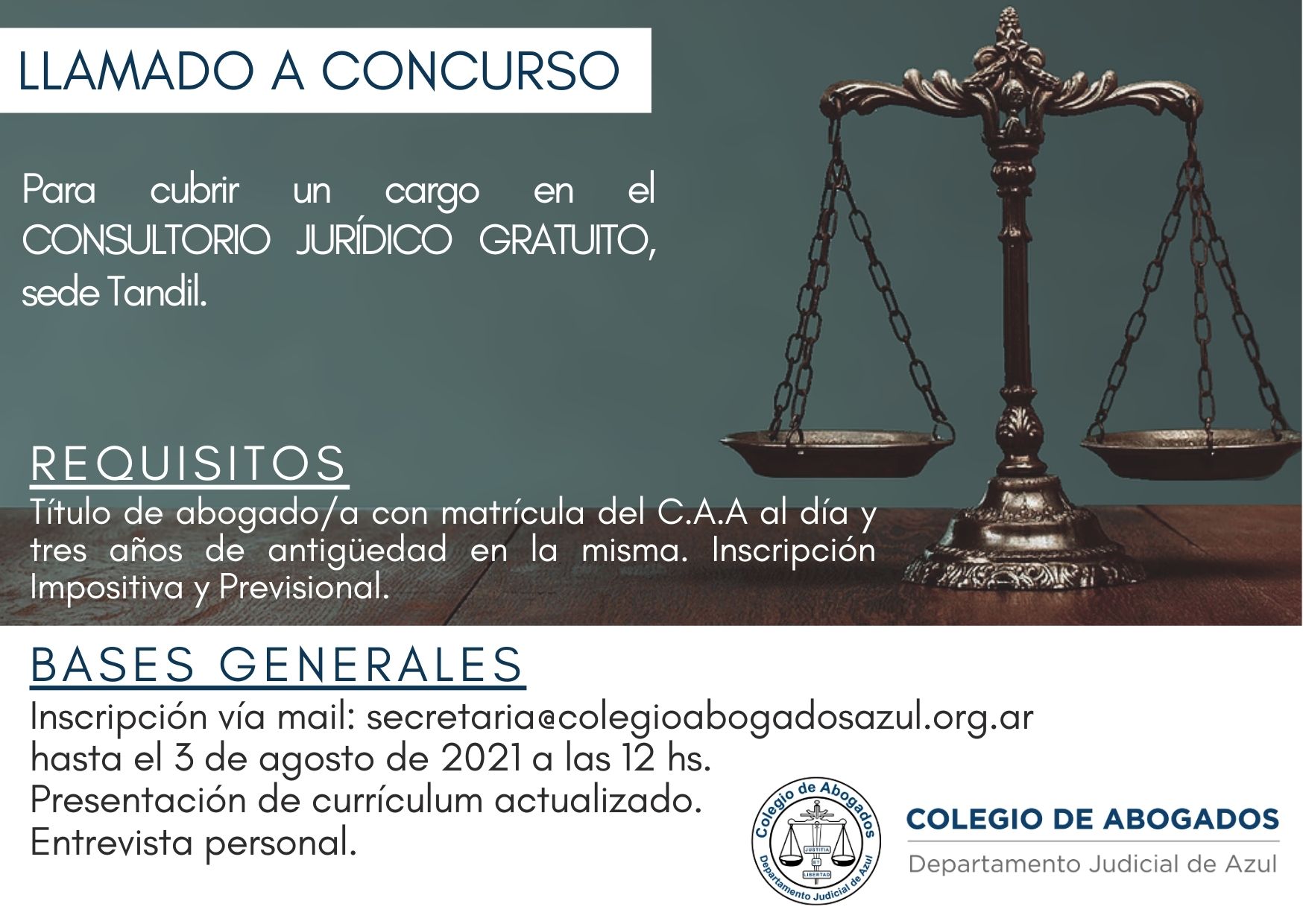 El Colegio de Abogados del Departamento Judicial de Azul llama a concurso para cubrir un cargo para el CONSULTORIO JURÍDICO GRATUITO en la subsede ubicada en la ciudad de TANDIL.