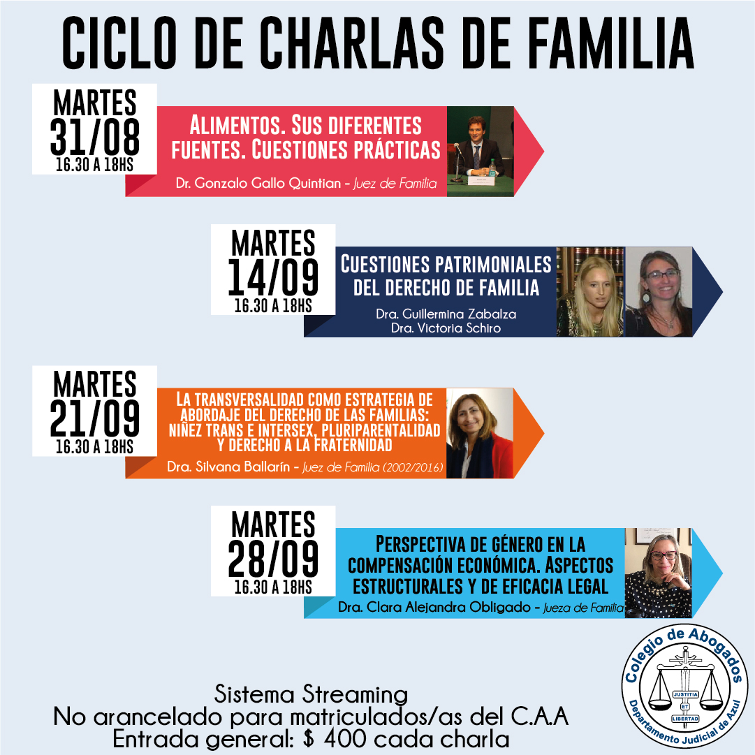 Organizado por el Colegio de Abogados del Departamento Judicial de Azul, se brindarán cuatro charlas con modalidad virtual, vía streaming, los días martes 31/08, 7/09, 14/09, 21/09 y 28/09, a las 16:30hs. Para participar deberás inscribirte previamente, vía formulario online, en cada una de ellas, de manera individual.