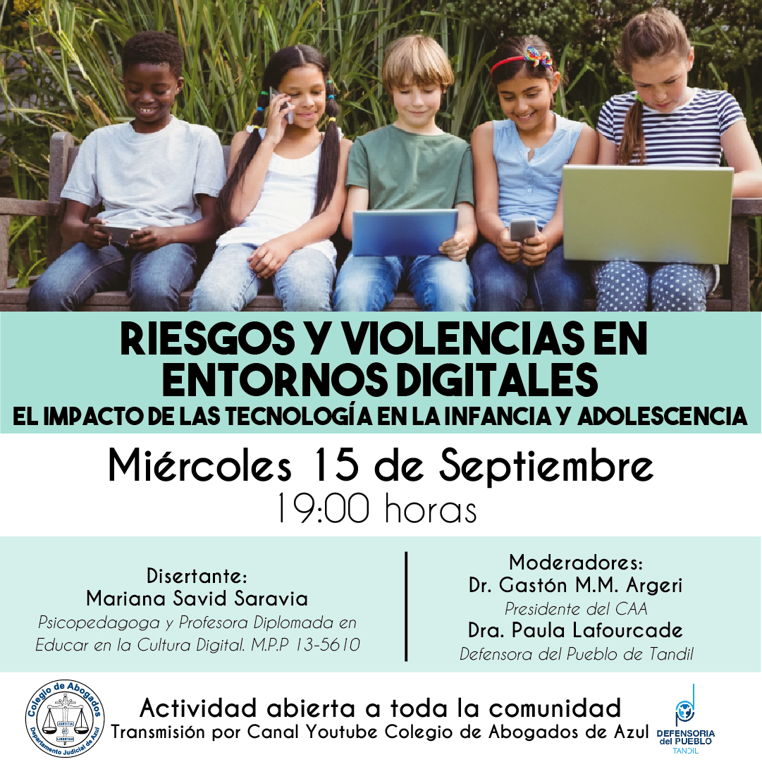 Este miércoles 15/09 a las 19hs, Mariana Savid Saravia, Psicopedagoga y Profesora Diplomada en Educar en la Cultura Digital. (M.P.P 13-5610) disertará sobre esta temática, a través del canal de YouTube del Colegio de Abogados Departamental. Los moderadores serán el Dr. Gastón Argeri, Presidente del C.A.A y la Dra. Paula Lafourcade, Defensora del Pueblo de Tandil. La actividad es abierta a toda la comunidad.