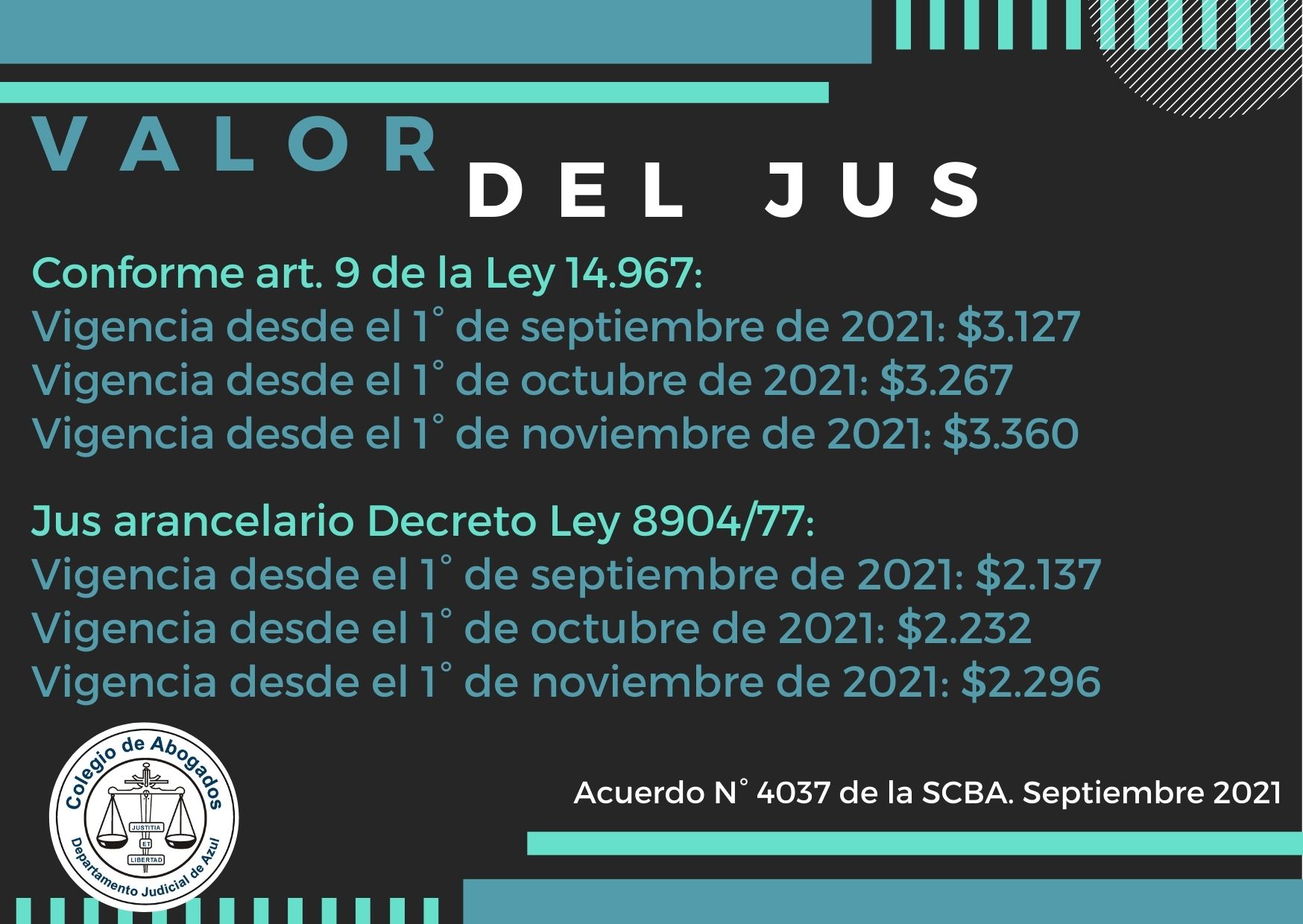 Miércoles 29 de Septiembre de 2021. Valor vigente del JUS. Informamos que mediante el Acuerdo N° 4037 de la SCBA, se establece: . “. . 1 - Fijar el valor del “Jus” conforme artículo 9 de la Ley .14 967 con vigencia desde el 1º de septiembre de 2021 en la suma de pesos tres mil ciento veintisiete (.3 127 pesos -); fijar el valor del mismo a partir del 1º de octubre de 2021 en la suma de pesos tres mil doscientos sesenta y siete (.3 267 pesos -) y desde el 1º de noviembre de 2021 en la suma de pesos tres mil trescientos sesenta (.3 360 pesos -) .2 - Adecuar el valor del “Jus arancelario decreto ley 8904 barra 77”, a partir del .1 de septiembre de 2021 en la suma de pesos dos mil ciento treinta y siete (.2 137 pesos -); fijar el valor del mismo a partir del 1º de octubre de 2021 en la suma de pesos dos mil doscientos treinta y dos (.2 232 pesos -) y desde el 1º de noviembre de 2021 en la suma de pesos dos mil doscientos noventa y seis (.2 296 pesos)”. Adjuntamos a continuación, como archivo descargable, la versión completa del Acuerdo N° 4037 de la Suprema Corte de Justicia de la Provincia de Buenos Aires. .