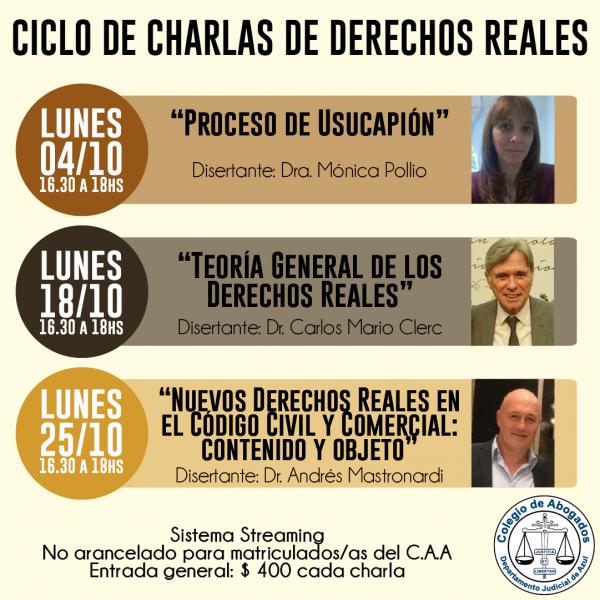 La primera disertación se llevó a cabo el pasado lunes 4 y estuvo a cargo de la Dra. Mónica Pollio quien se refirió al proceso de usucapión. La próxima fecha será el 18 de este mes con disertación del Dr. Carlos Mario Clerc sobre "Teoría general de los Derechos Real" mientras que el lunes 25 el ciclo finalizará con la presencia de Andrés Mastronardi quien abordará la temática “Nuevos Derechos Reales en el Código Civil y Comercial: contenido y objeto”.