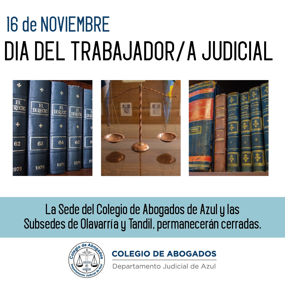 El Colegio de Abogados del Departamento Judicial de Azul les desea MUY FELIZ DÍA a quienes trabajan con vocación, responsabilidad y compromiso. Las sedes de Azul, Olavarría y Tandil permanecerán cerradas.