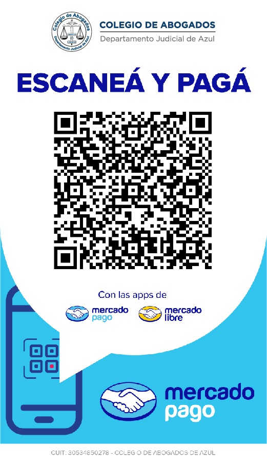 En caso de abonar con DEPÓSITO o TRANSFERENCIA BANCARIA, es INDISPENSABLE que envíe un mail a: tesoreria@colegioabogadosazul.org.ar adjuntando el comprobante de dicha operación para que el pago sea imputado en su cuenta.
