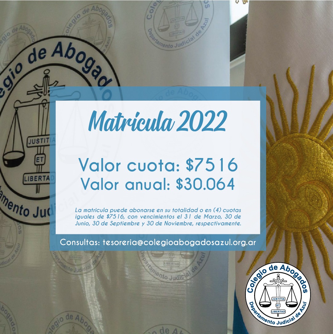 Debido al aumento del JUS establecido por Acuerdo de la SCJBA N° 4065, este viernes 1º de julio aumentará el valor de la cuota de la matrícula. Esto es importante teniendo en cuenta el vencimiento que opera hoy, como último día, con el monto calculado en base al 90% de 8 Jus arancelarios, tomándose el Jus Arancelario Ley Nº 14.967 de $4.176 (vigente desde el 1º de marzo).