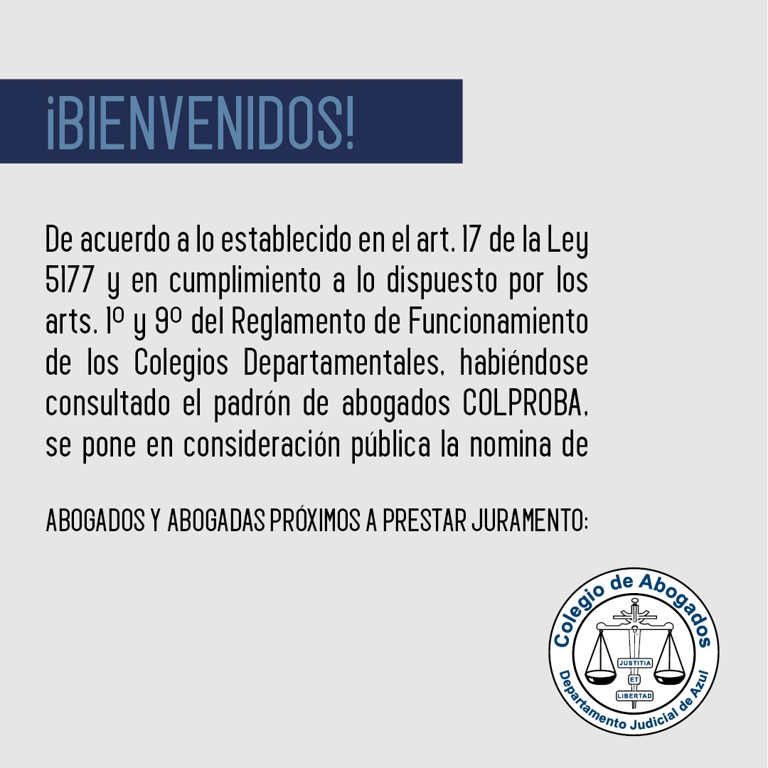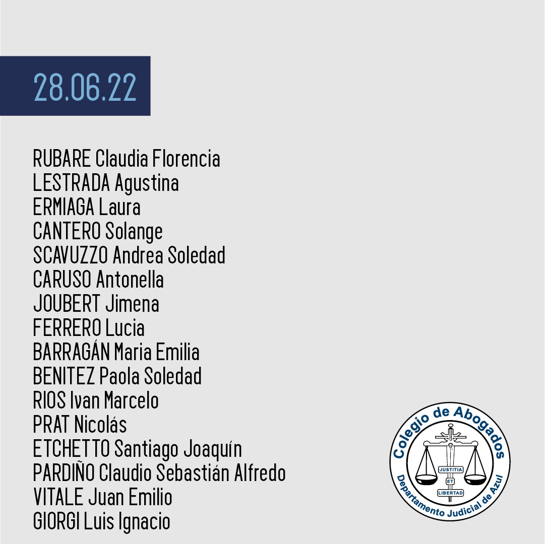A las 12.30hs con modalidad presencial, en la sede de Azul (Av. Perón 514) y transmisión vía YouTube, las autoridades del Colegio de Abogados Departamental tomarán juramento a las abogadas y abogados cuya nómina ponemos en consideración pública...