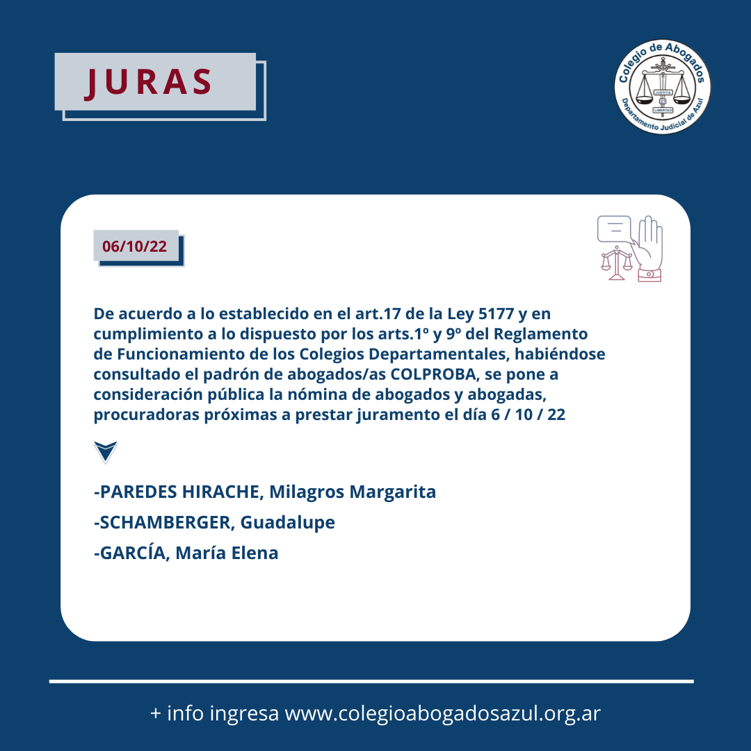 El jueves 6 de octubre a las 13hs, con modalidad presencial en la sede de Azul (Av. Perón 514) y transmisión vía YouTube; las autoridades del Colegio de Abogados Departamental tomarán juramento a las abogadas y abogados cuya nómina ponemos en consideración pública...