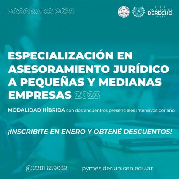 Por otra parte, la Especialización en Asesoramiento Jurídico a pequeñas y medianas empresas procura dotar a los abogados/as de los conocimientos necesarios para asesorar a la pequeña y mediana empresa, de modo que puedan alcanzar y sostener una estructura formal y generar todas las condiciones jurídicas para un crecimiento económico sustentable.