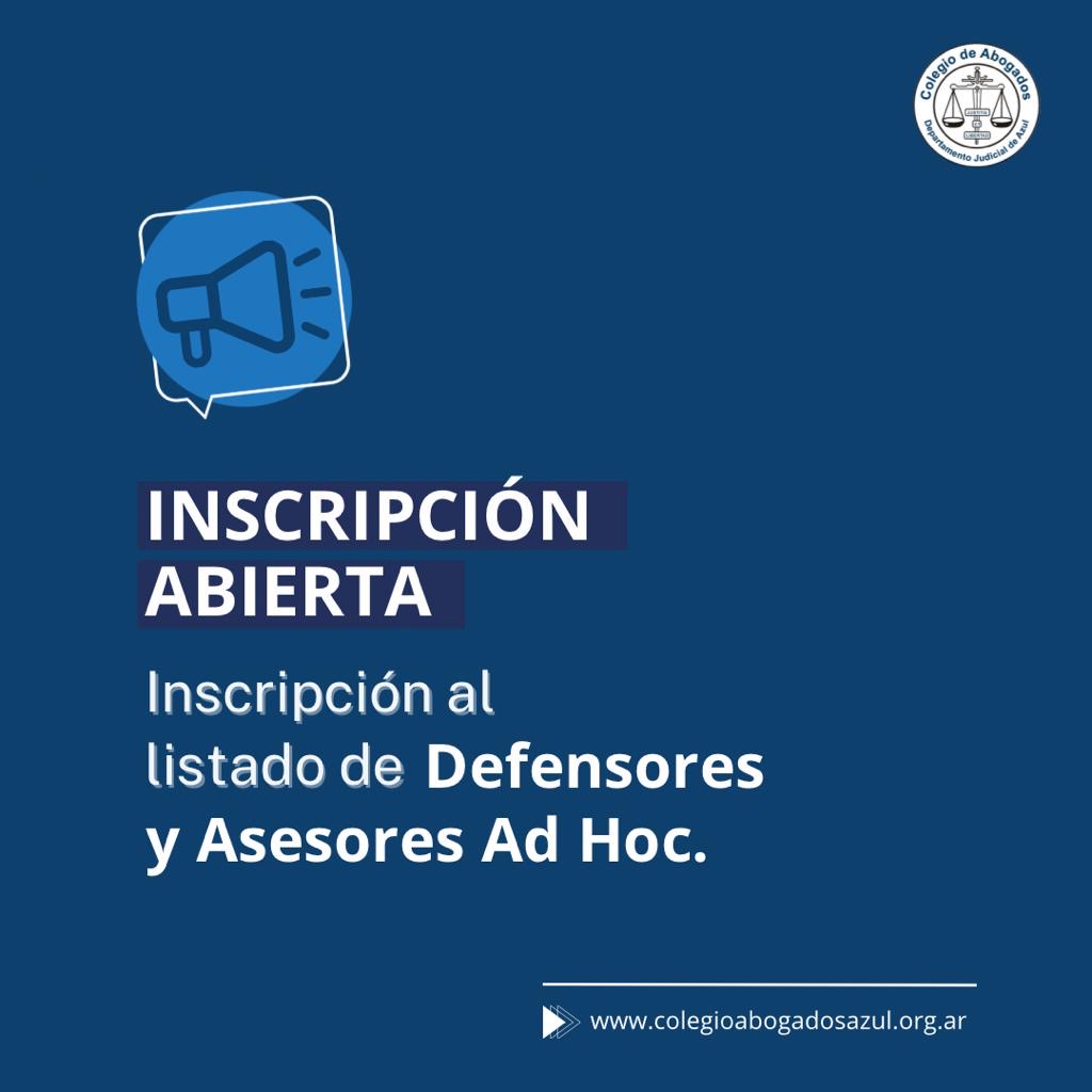 La inscripción se podrá efectuar ante el Colegio de Abogados Departamental por e-mail a secretaria@colegioabogadosazul.org.ar, hasta el 29 de diciembre de 2023 inclusive.