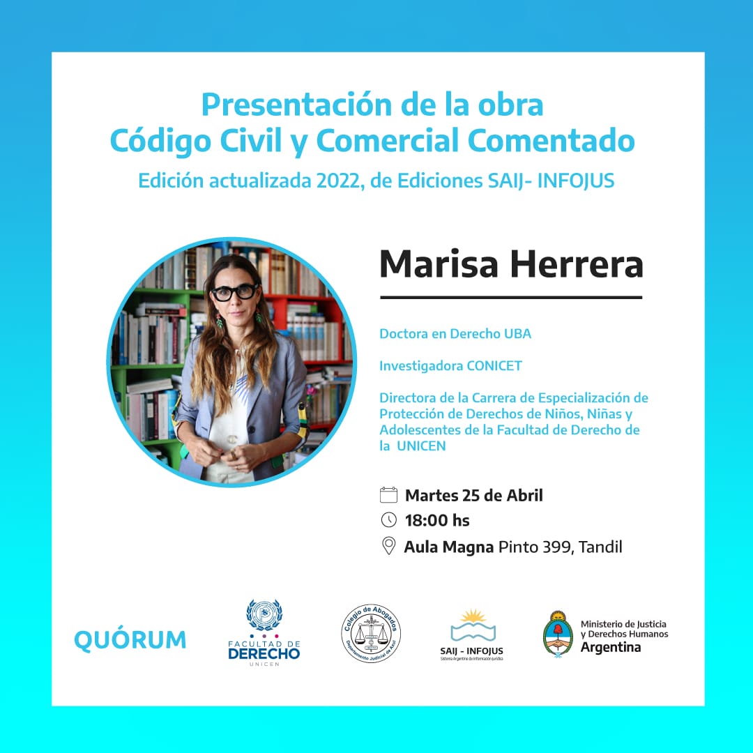 El Colegio de Abogados Departamental en conjunto con Quórum, Facultad de Derecho – UNICEN e INFOJUS han organizado la Presentación de la obra Código Civil y Comercial Comentado, Edición actualizada 2022, a cargo de Marisa Herrera. Se realizará el día martes 25 de abril a las 18 hs en el Aula Magna de la UNICEN (Pinto 399 - Tandil).