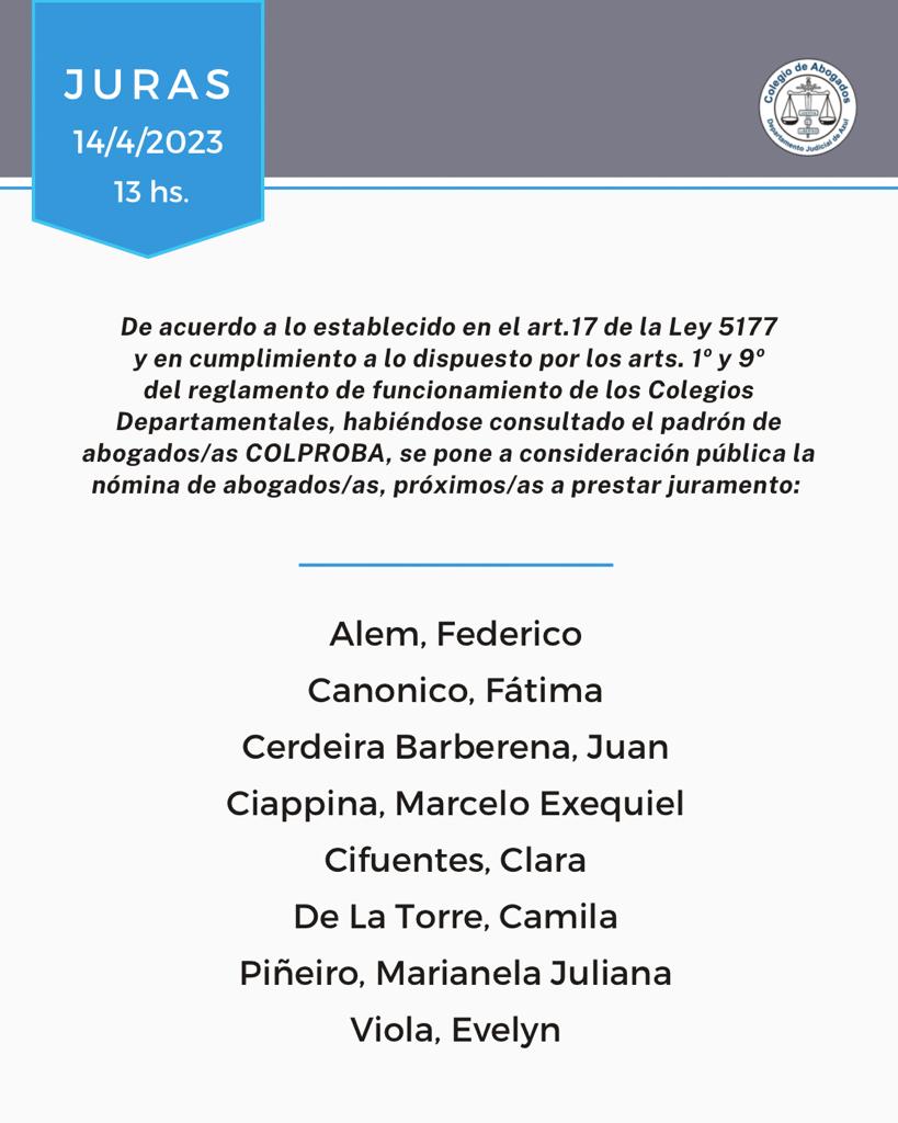 El viernes 14 de abril a las 13 hs, con modalidad presencial en la sede de Azul (Av. Perón 514) y transmisión vía YouTube; las autoridades del Colegio de Abogados Departamental tomarán juramento a las abogadas y abogados cuya nómina ponemos en consideración pública...