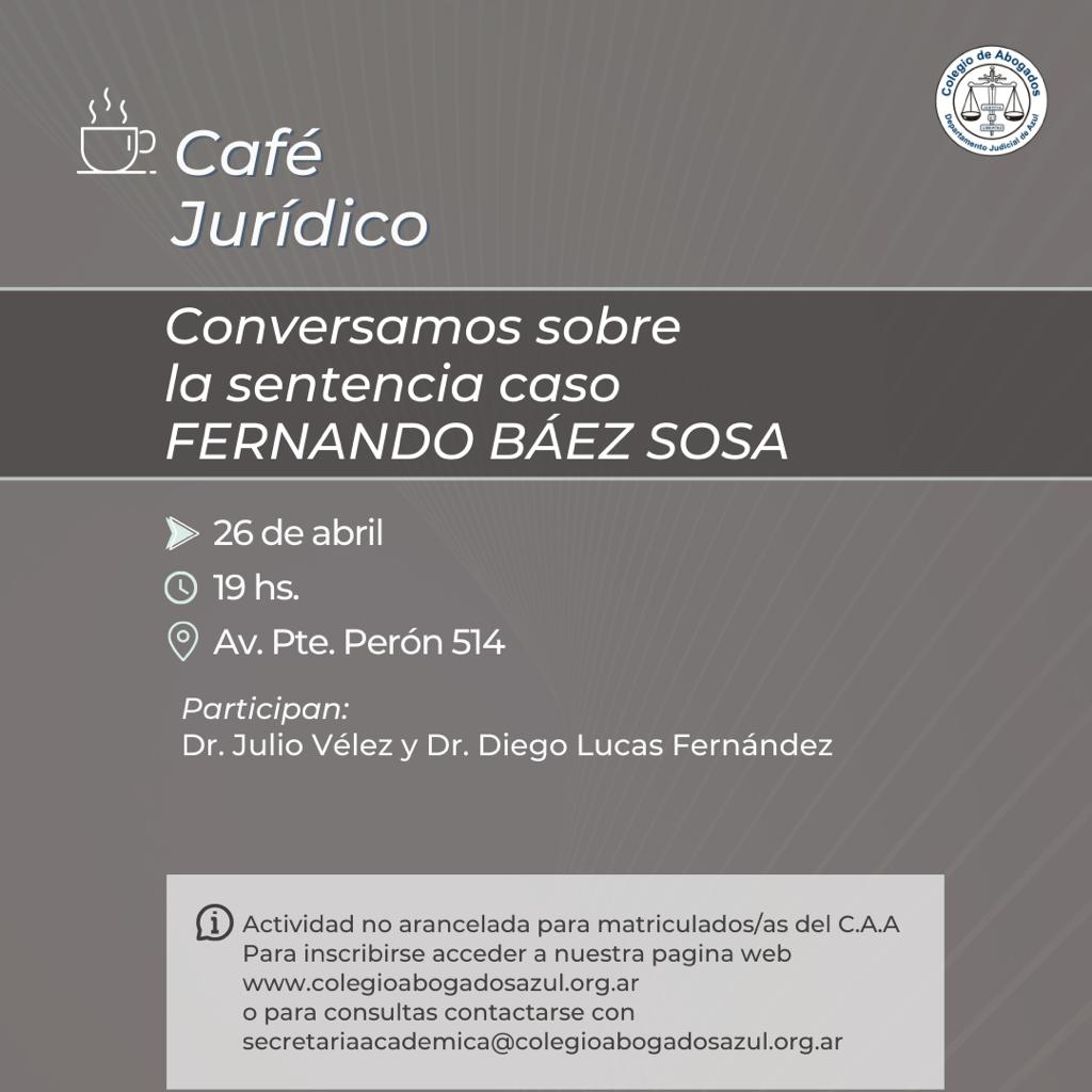 El Colegio de Abogados del Departamento Judicial de Azul ha organizado un Café Jurídico para dialogar sobre la sentencia del caso Fernando Baez Sosa. Contará con la participación de los Dres. Julio Vélez y Diego Lucas Fernández y se realizará el miércoles 26 de abril a las 19 hs en la sede del Colegio en Av. Perón N° 514.