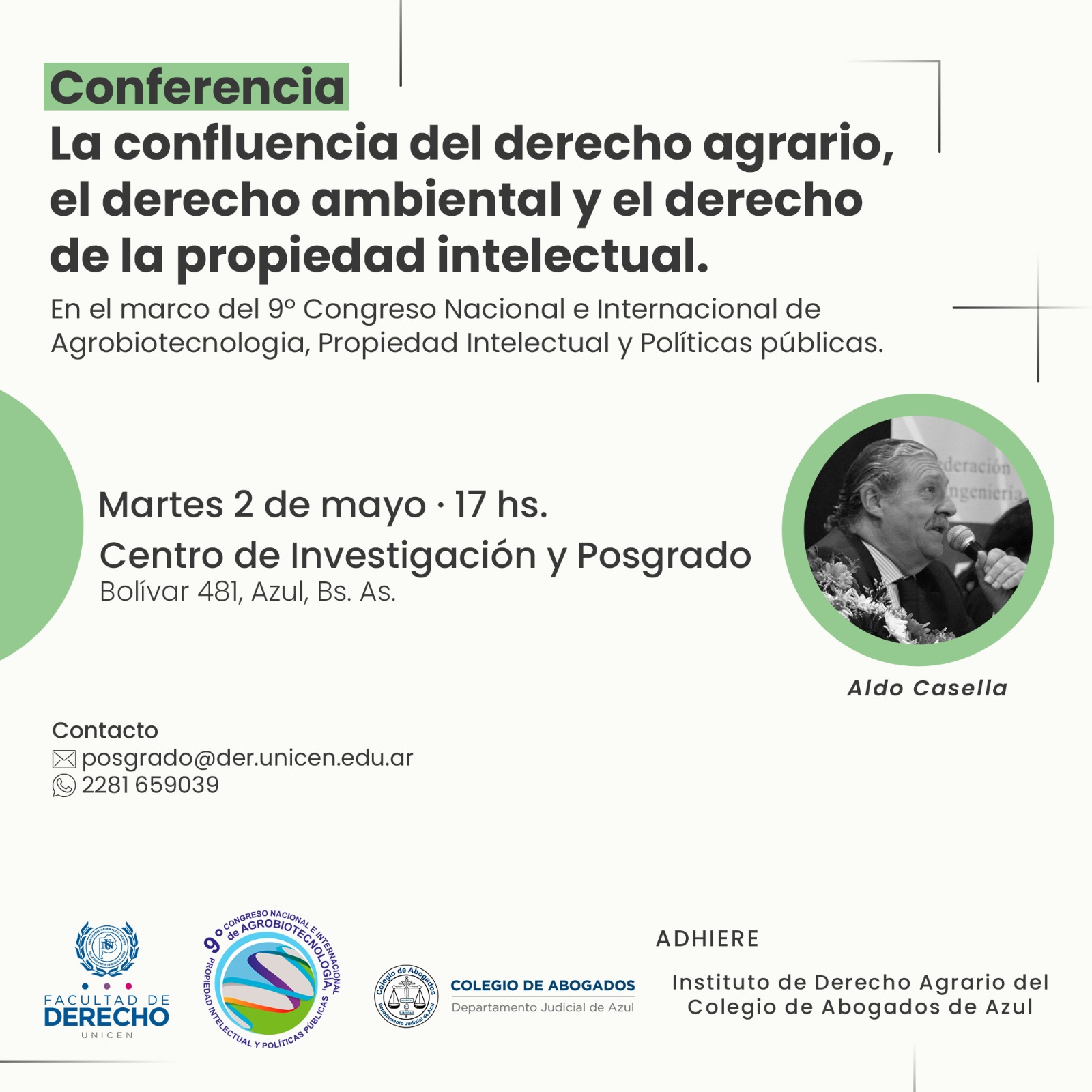 El Colegio de Abogados Departamental junto con la Facultad de Derecho de la UNICEN organizaron una conferencia que encabezará el Dr. Aldo Casella en el marco del 9° Congreso Nacional e Internacional de Agrobiotecnología, Propiedad Intelectual y Políticas públicas. Se realizará hoy a las 17 hs en el Centro de Investigación y Posgrado de la Facultad de Derecho de la UNICEN (Bolívar 481).