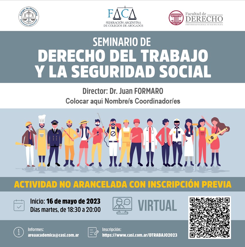 Mañana comienza el Seminario de Derecho del Trabajo y la Seguridad Social a desarrollarse en alianza entre la Federación Argentina de Colegios de Abogados (FACA) y la Facultad de Derecho de la Universidad Nacional de Mar del Plata. Se trata de una actividad no arancelada para matriculados/as de los Colegios, Asociaciones y consejos de la abogacía adherentes e integrantes de la FACA.