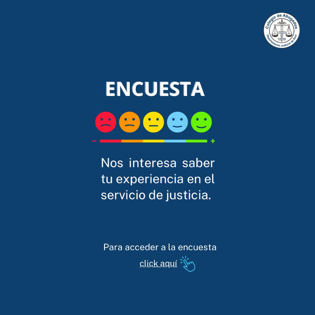 Nos interesa conocer la experiencia de nuestros/as matriculados/as, por eso desde Colegio de Abogados Departamental creamos una encuesta que tiene como objetivo, colaborar con el desarrollo de la función y armonizar con el Poder Judicial la actividad diaria en Tribunales para poder evaluar la situación de nuestros órganos jurisdiccionales.
