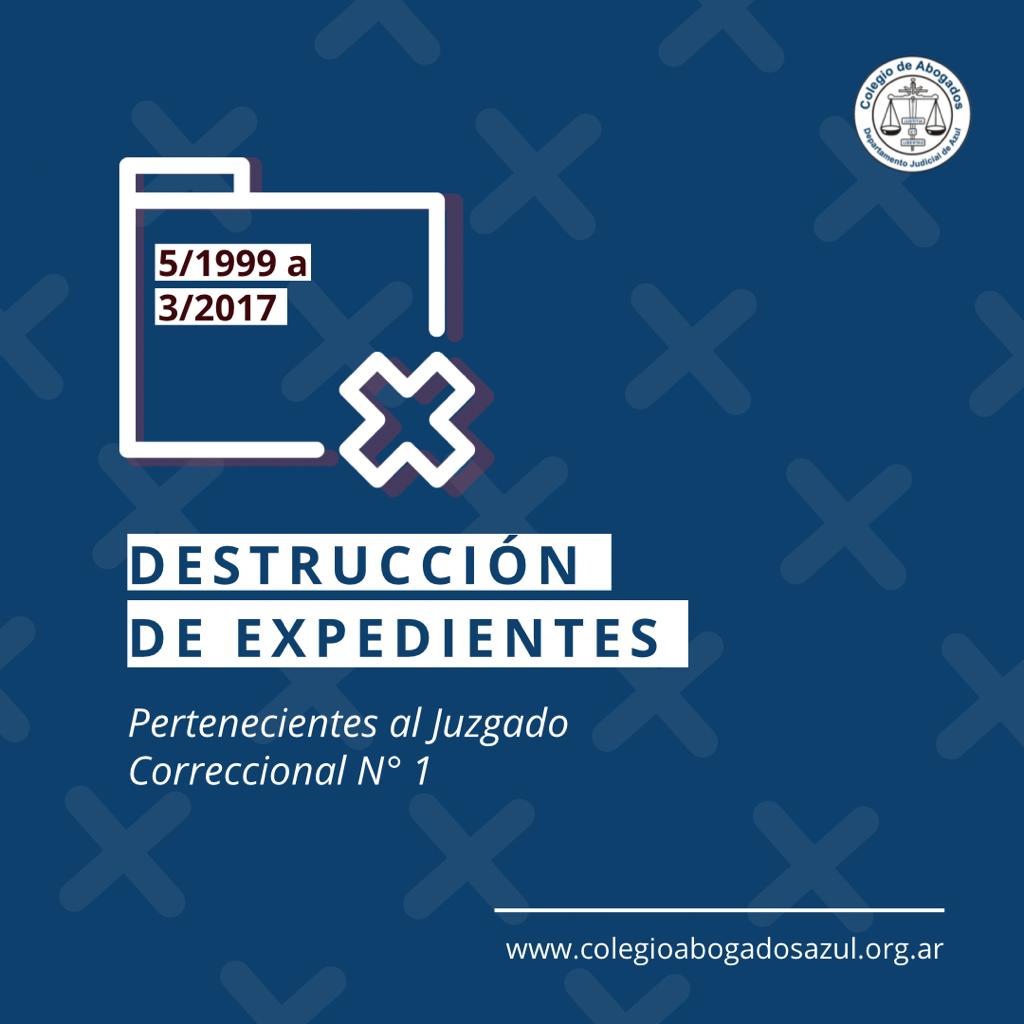 El miércoles 30 de agosto del corriente año, se procederá a la destrucción de expedientes pertenecientes al Juzgado Correccional N° 1 con fecha de inicio de las actuaciones entre mayo de 1999 y marzo del año 2017 que se encuentran en este órgano.