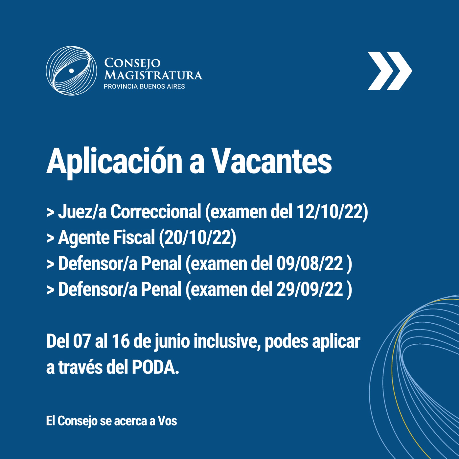 Desde el 7 de junio al 16 inclusive, se encuentra habilitada en el PODA la opción para aplicar a vacantes en los cargos de Juez/a Correccional (examen del 12/10/22), Agente Fiscal (20/10/22) y Defensor/a Penal (exámenes correspondientes al 09/08/22 y 29/09/22) según Resolución 3362.