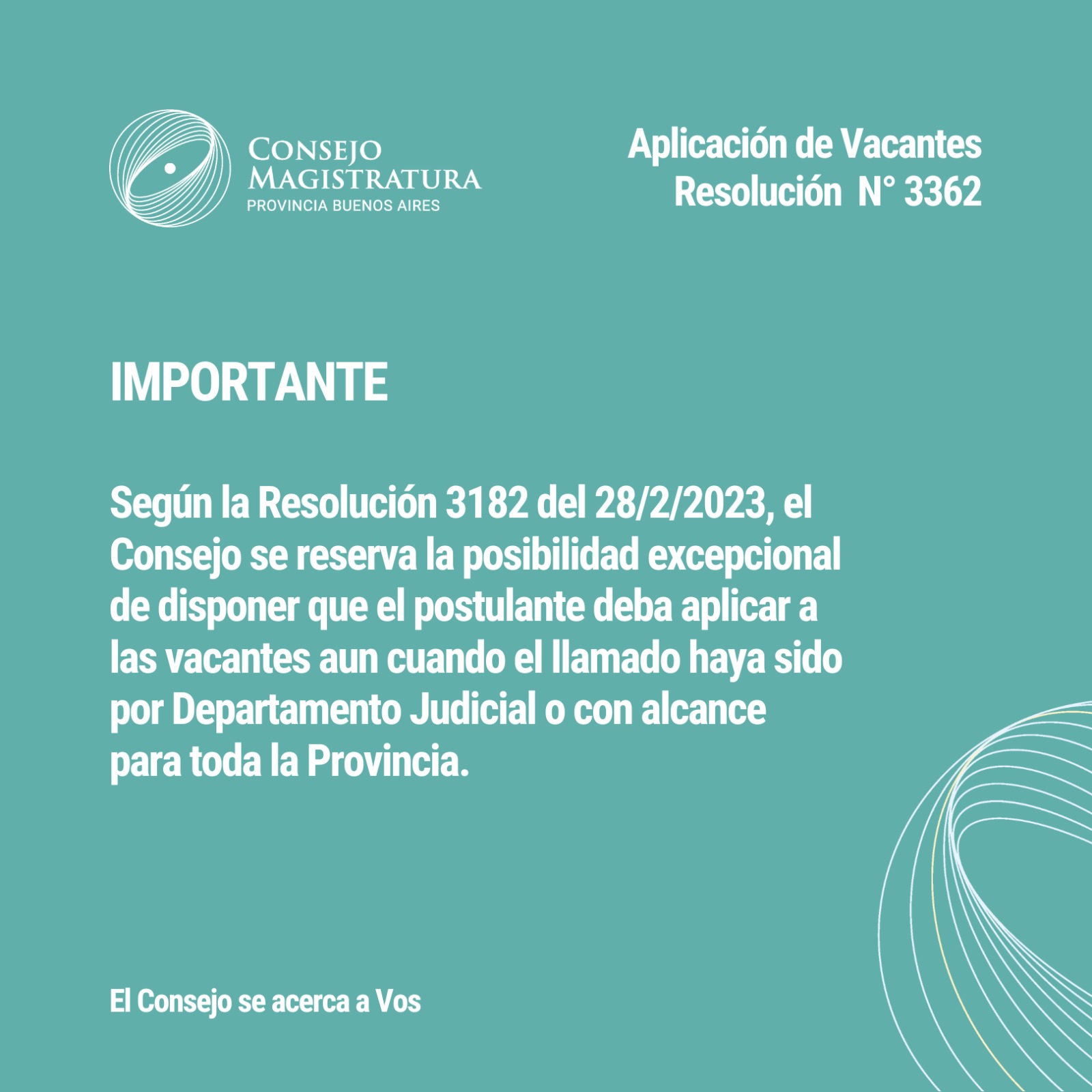 Cabe destacar que el Consejo se reserva la posibilidad excepcional de disponer que el postulante deba aplicar a las vacantes aun cuando el llamado haya sido por Departamento Judicial o con alcance para toda la Provincia.