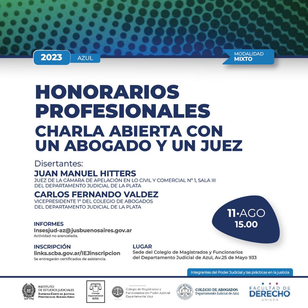 El viernes 11 de agosto a las 15 hs se llevará a cabo una charla abierta sobre Honorarios Profesionales en el Colegio de Magistrados y Funcionarios del Departamento Judicial de Azul organizada por el Instituto de Estudios Judiciales de la SCBA y el Colegio de Magistrados y Funcionarios Departamental. Auspicia el Colegio de Abogados del Departamento Judicial de Azul y la Facultad de Derecho UNICEN.