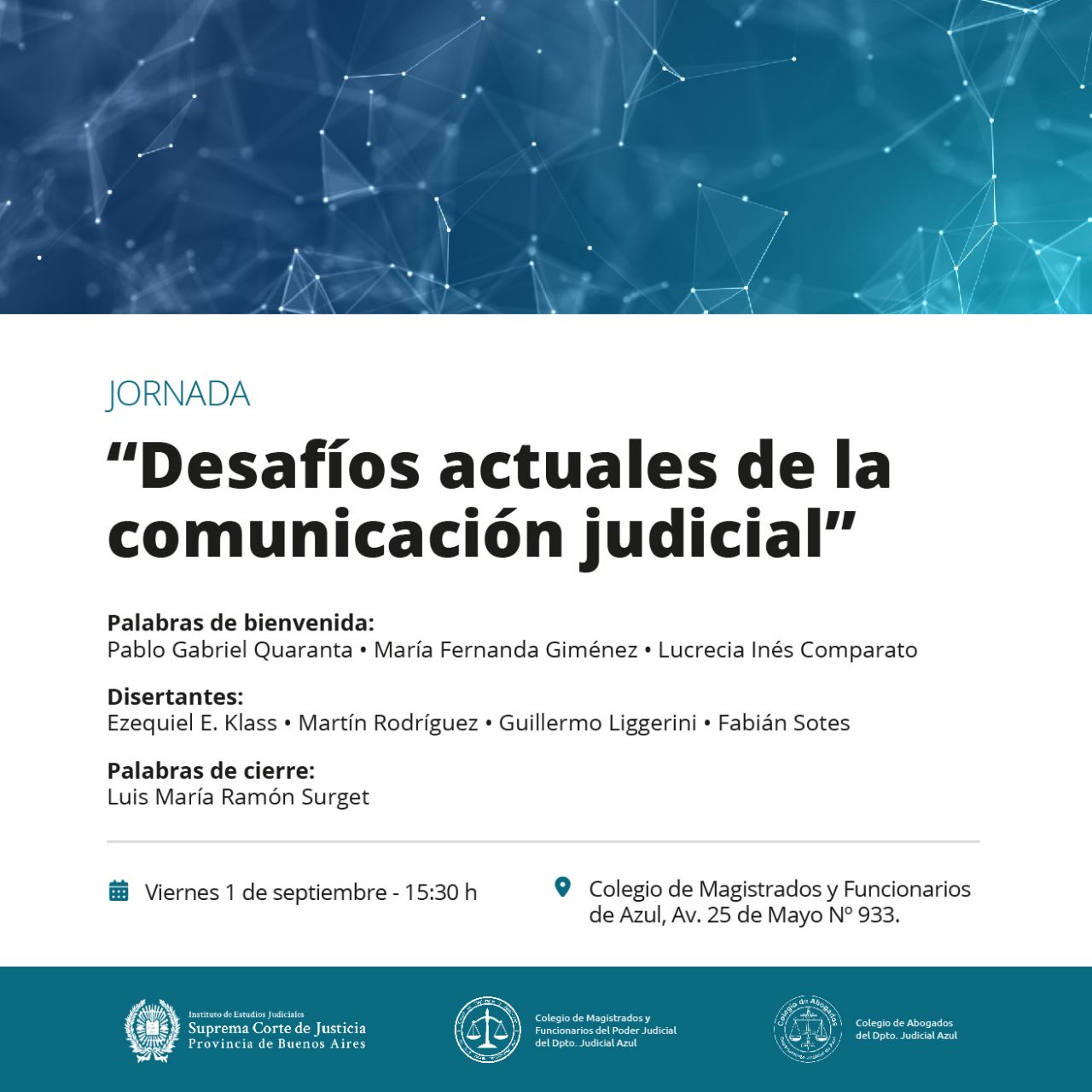 Este viernes 1° de septiembre a las 15.30 hs se llevará a cabo en la sede del Colegio de Magistrados y Funcionarios de Azul (Av. 25 de Mayo 933) la jornada titulada “Desafíos actuales de la comunicación judicial”.