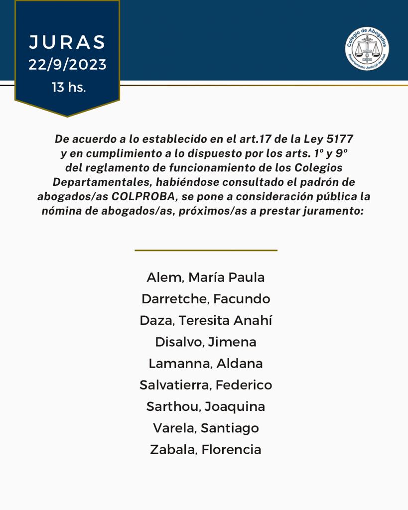 El viernes 22 de septiembre a las 13 hs, con modalidad presencial en la sede de Azul (Av. Perón 514) y transmisión vía YouTube; las autoridades del Colegio de Abogados Departamental tomarán juramento a las abogadas y abogados cuya nómina ponemos en consideración pública.
