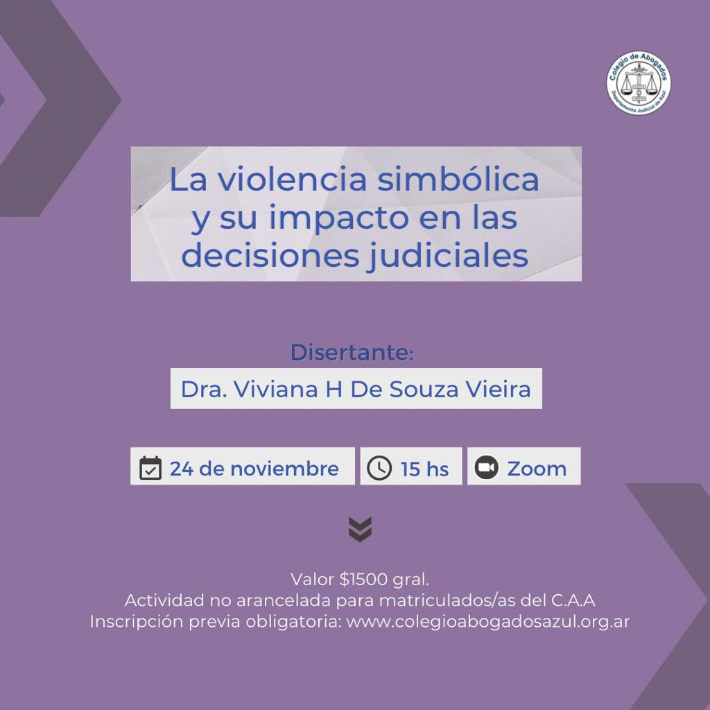 El Instituto de Violencia Familiar y de Género del C.A.A. organizó la charla “La violencia simbólica y su impacto en las decisiones judiciales" que se transmitirá mediante el sistema de videoconferencias Zoom y se realizará en 24 de noviembre a las 15 hs.