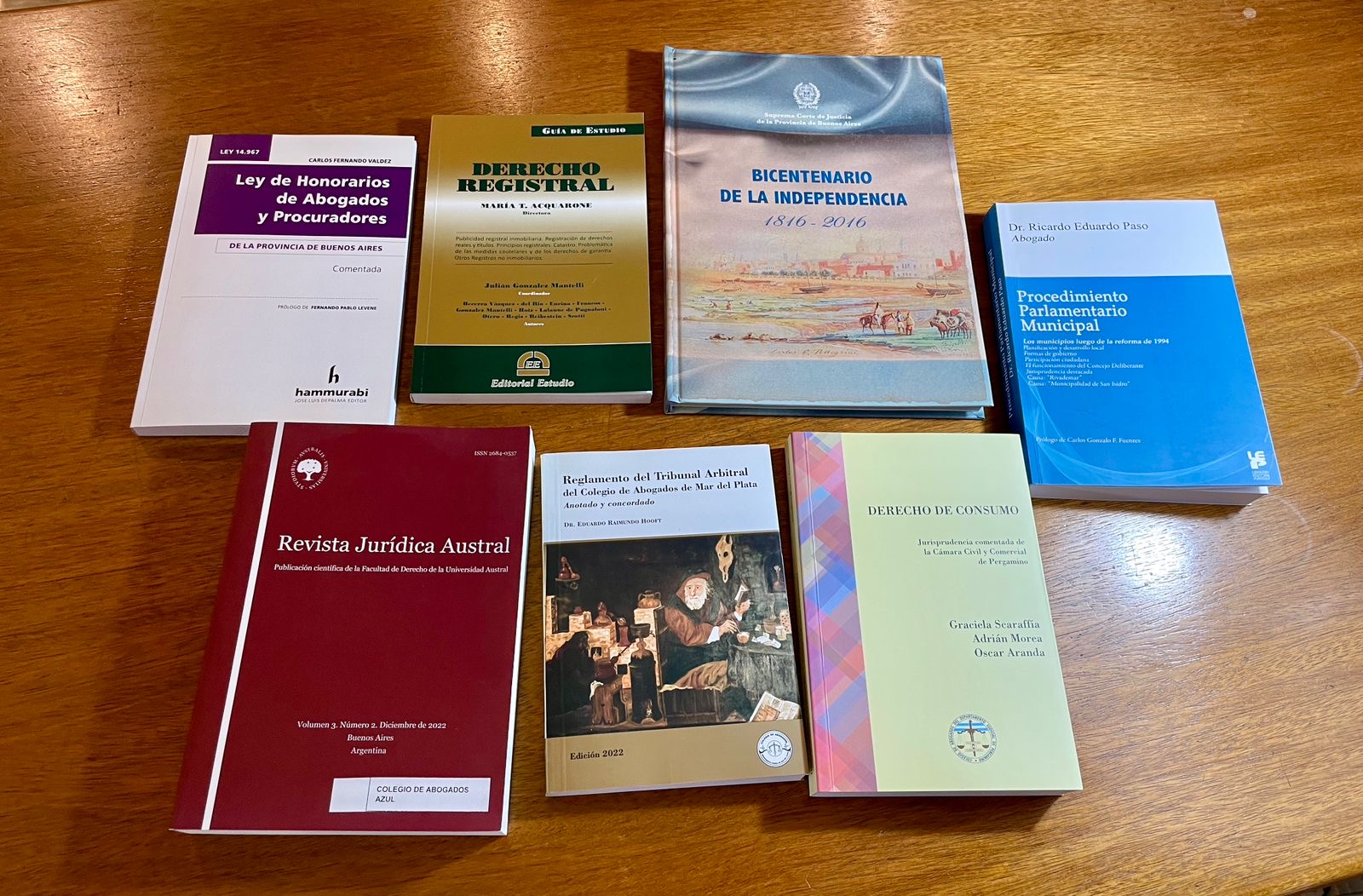 Miércoles 6 de Diciembre de 2023. 15 nuevos títulos se suman a la Biblioteca del Colegio de Abogados Departamental. Durante este año, el Colegio de Abogados del Departamento Judicial de Azul recibió 15 donaciones de libros que abordan distintas áreas del Derecho que se suman a la Biblioteca para ser consultados por quienes estén interesados/as. . Los títulos se mencionan a continuación: