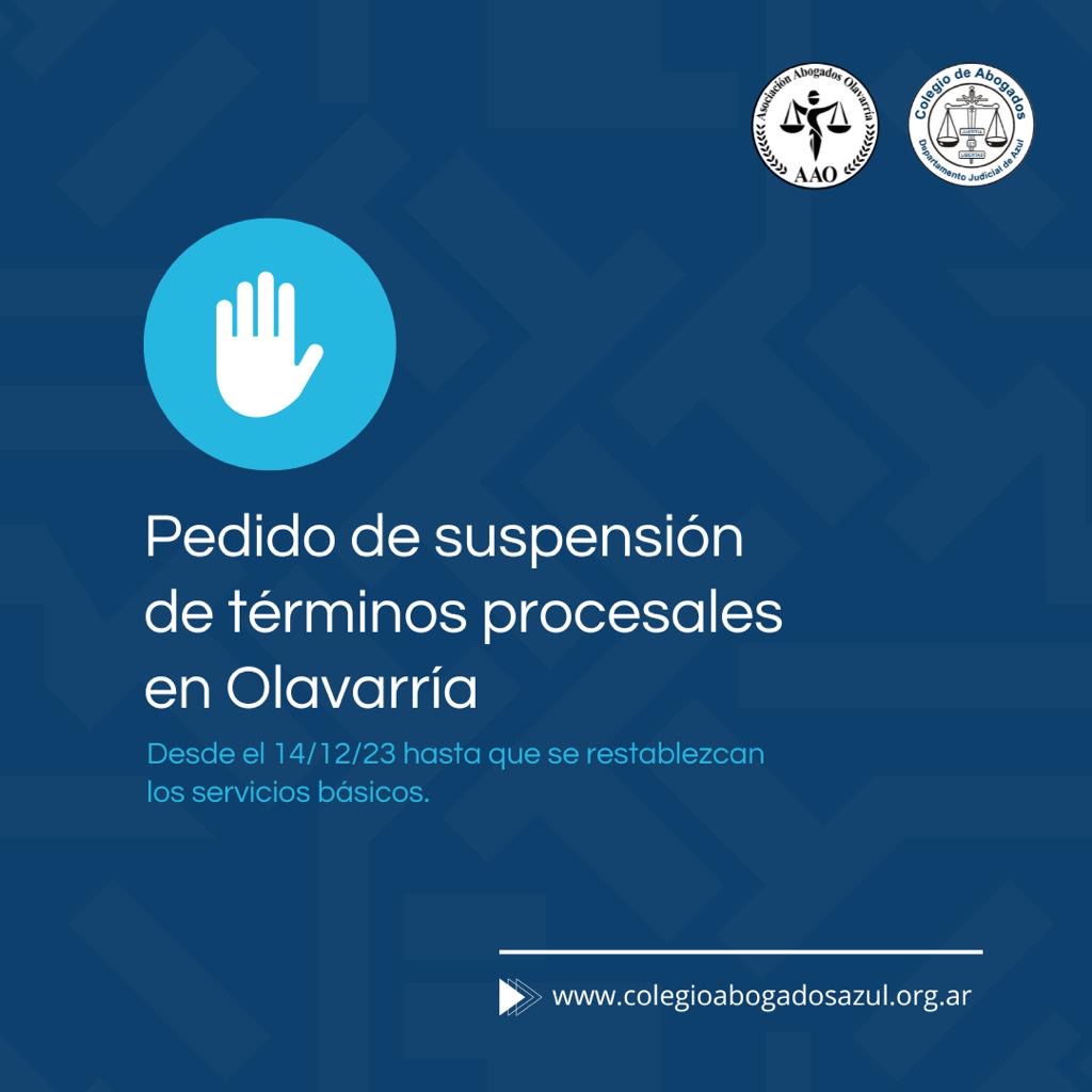 Ante el estado de emergencia declarado en la ciudad de Olavarría se solicitó a la SCBA la suspensión de términos procesales en la ámbito de dicha ciudad dado que resulta imposible ofrecer las prestaciones básicas ante la interrupción energética ocasionada por el temporal.